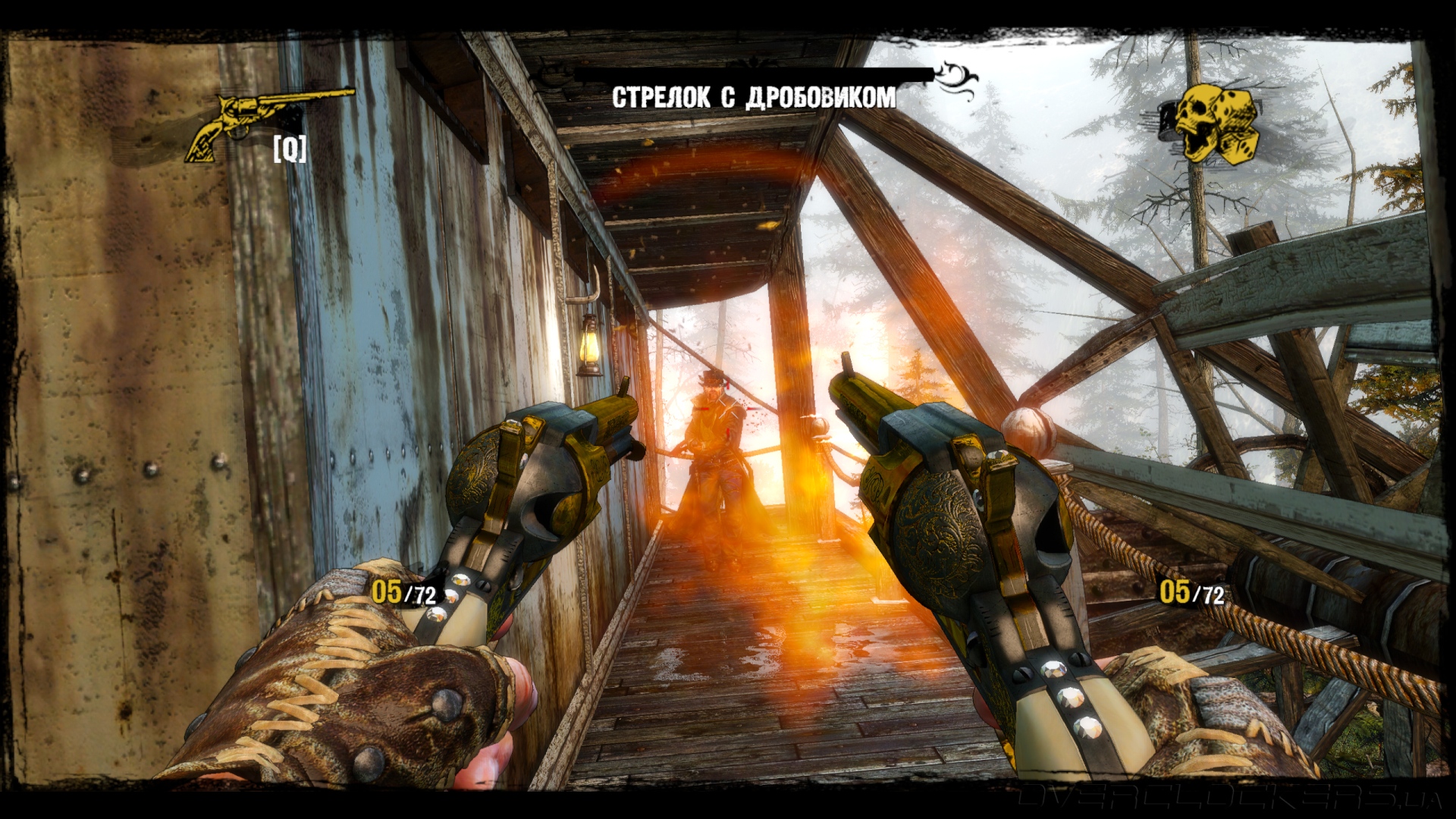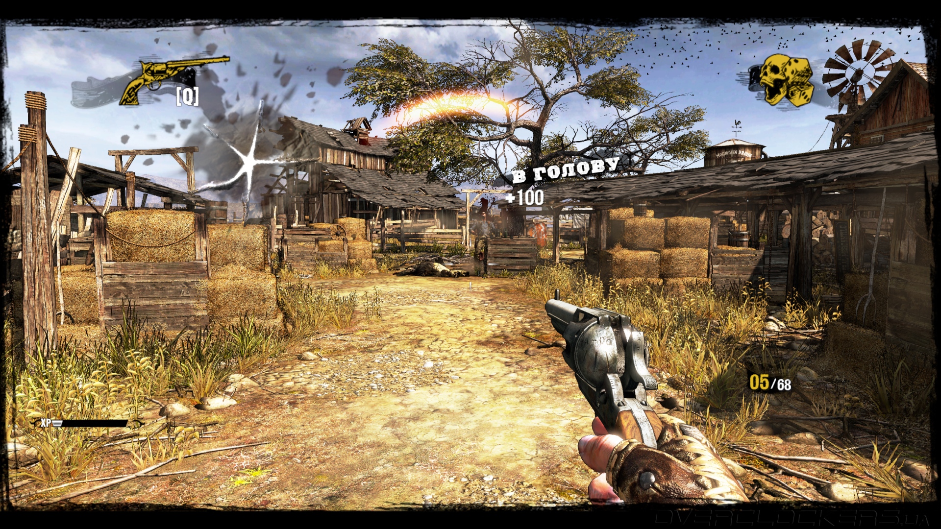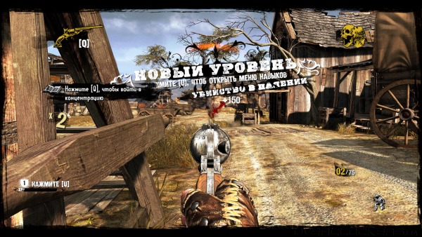Эти очки опыта нужны для прокачки умений, которые разделены на три ветки. Можно научиться обращению с двумя револьверами, ускоренной перезарядке, ношению большего числа патронов, быстрому прицеливанию и даже небольшому замедлению времени в этом режиме. Говоря об арсенале нужно отметить, что он включает вполне привычный набор из револьвера, винтовки и дробовика с редкими вариациями. Есть еще динамитные шашки, с которыми тоже можно выполнять разные трюки, если открыть соответствующие способности в нужной ветке прокачки — подбивать их в воздухе или откидывать брошенный под ноги динамит.