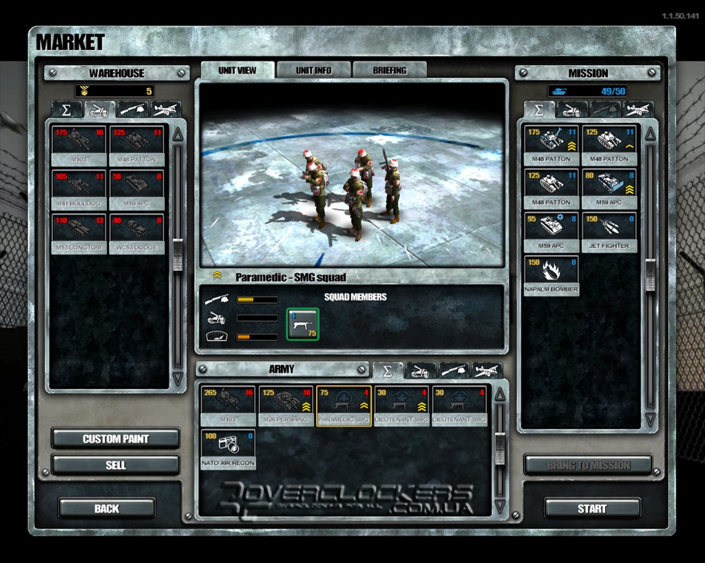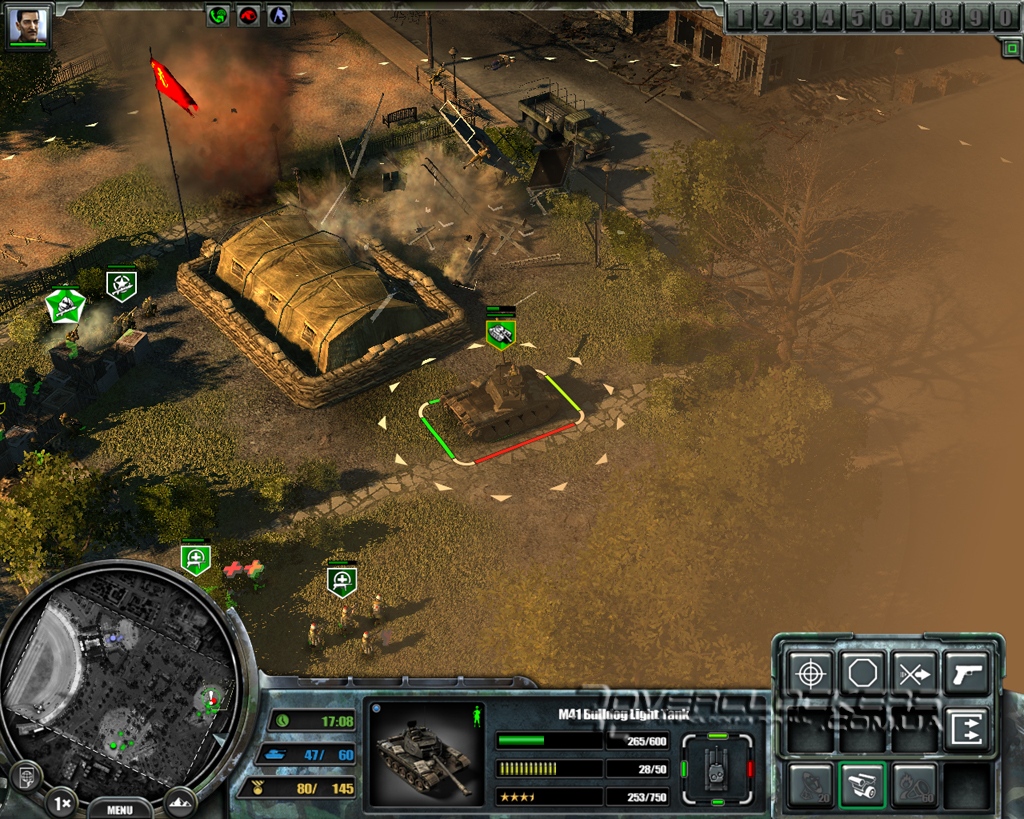 В зависимости от рейтинга прохождения миссии мы получаем специальные очки, за которые можем в перерывах между зданиями приобрести парочку новых отрядов или танков, заодно сразу и проапгрейдив их. Впрочем, тип миссии ограничивает количество и тип выбранных отрядов – взять танк с собой для высадки в тыл врага не удастся. Кроме отрядов можно обзавестись и поддержкой с воздуха – ракетный или напалмовый авиаудар (что может спасти в крайней ситуации) или возможность произвести разведку недоступной территории.
