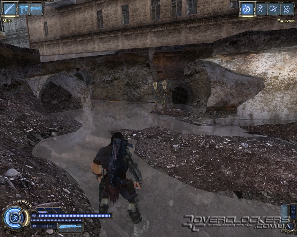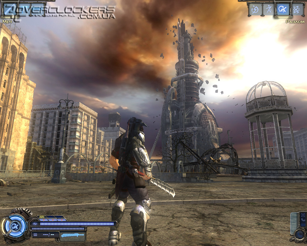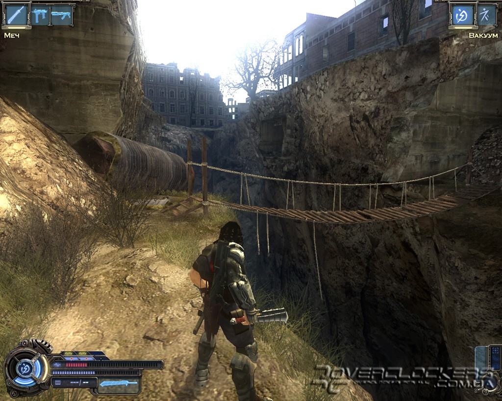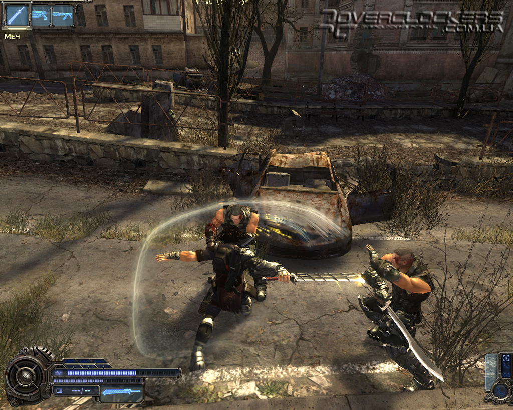 Игре после недавнего пришествия Devil May Cry 4 не избежать сравнений с детищем Capcom. Однако на самом деле общего у них немного. Взять хотя бы главного героя. Это вам не щупленький Данте на тоненьких ножках и с огромным мечом в два раза больше него самого. Наш Родан - типичный славянский типаж, сдобренный современными генными технологиями и африканскими дредами. Бугры мышц еле помещаются под обтягивающим костюмчиком, на ногах здоровенные металлические ботинки и бронированный наплечник с наручами. Для полноты ощущений этот образ рыцаря XXI века дополняется маленьким детским рюкзачком за спиной главного героя (надо же где-то боеприпасы хранить).