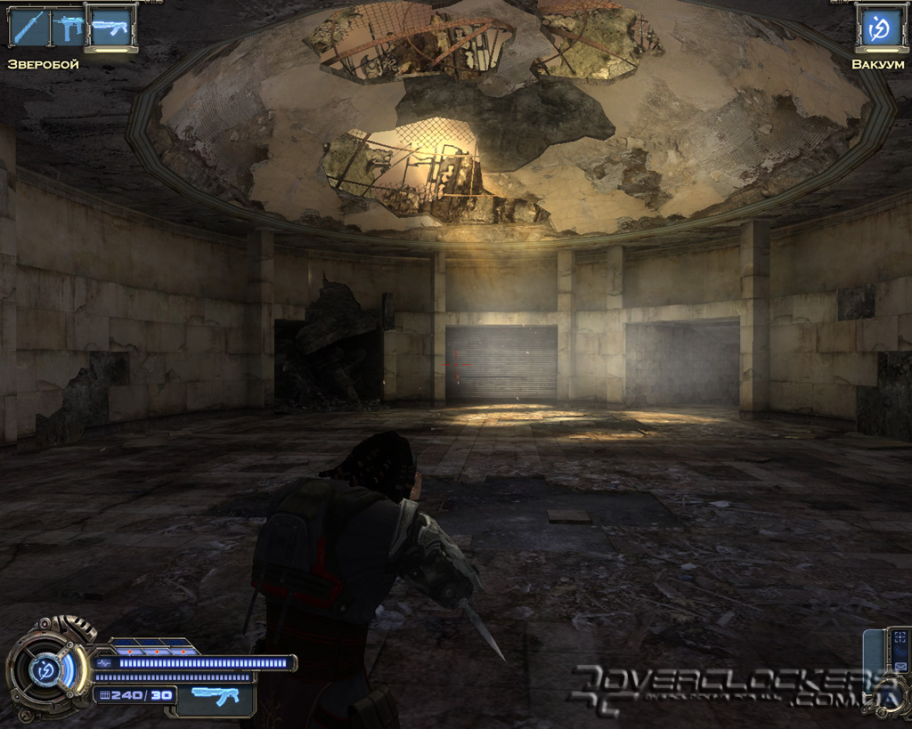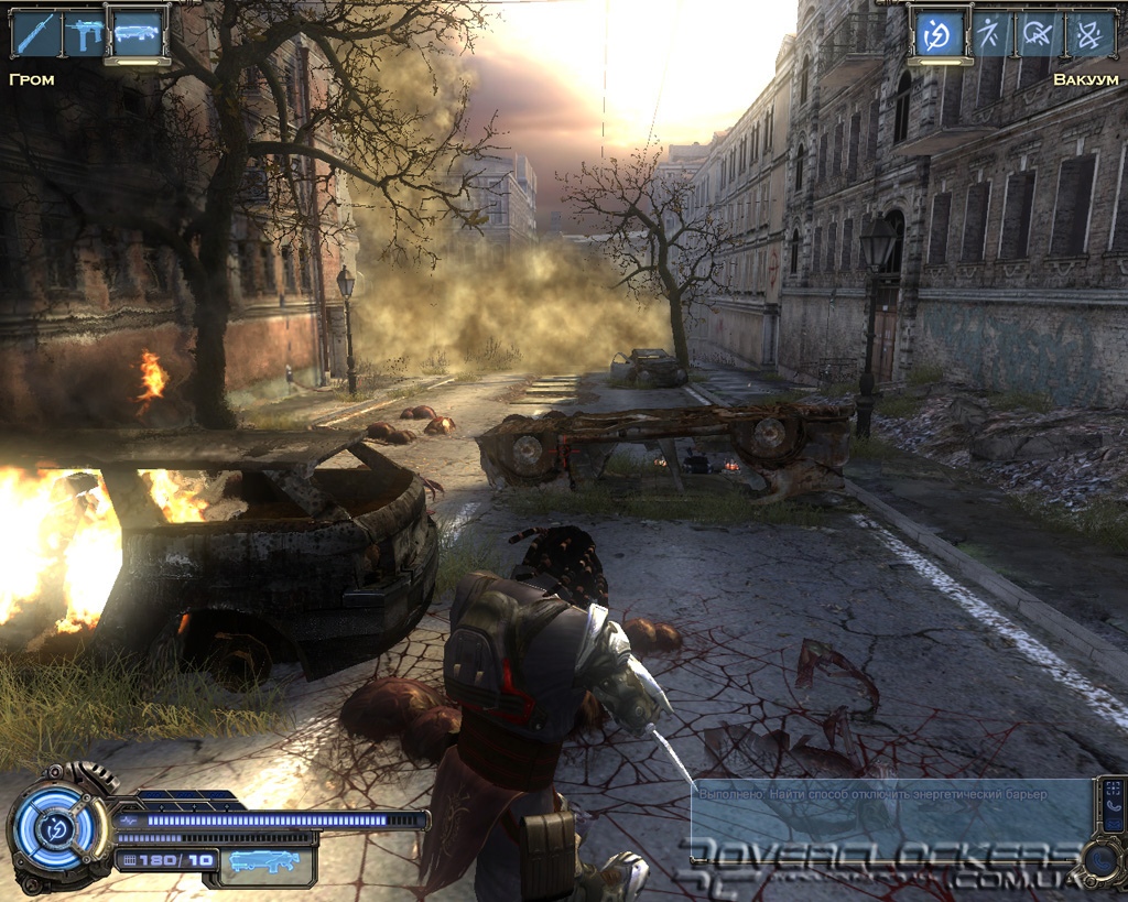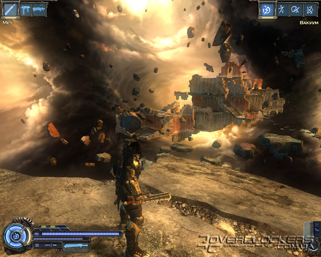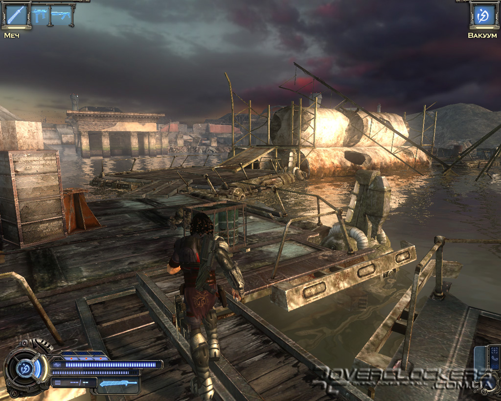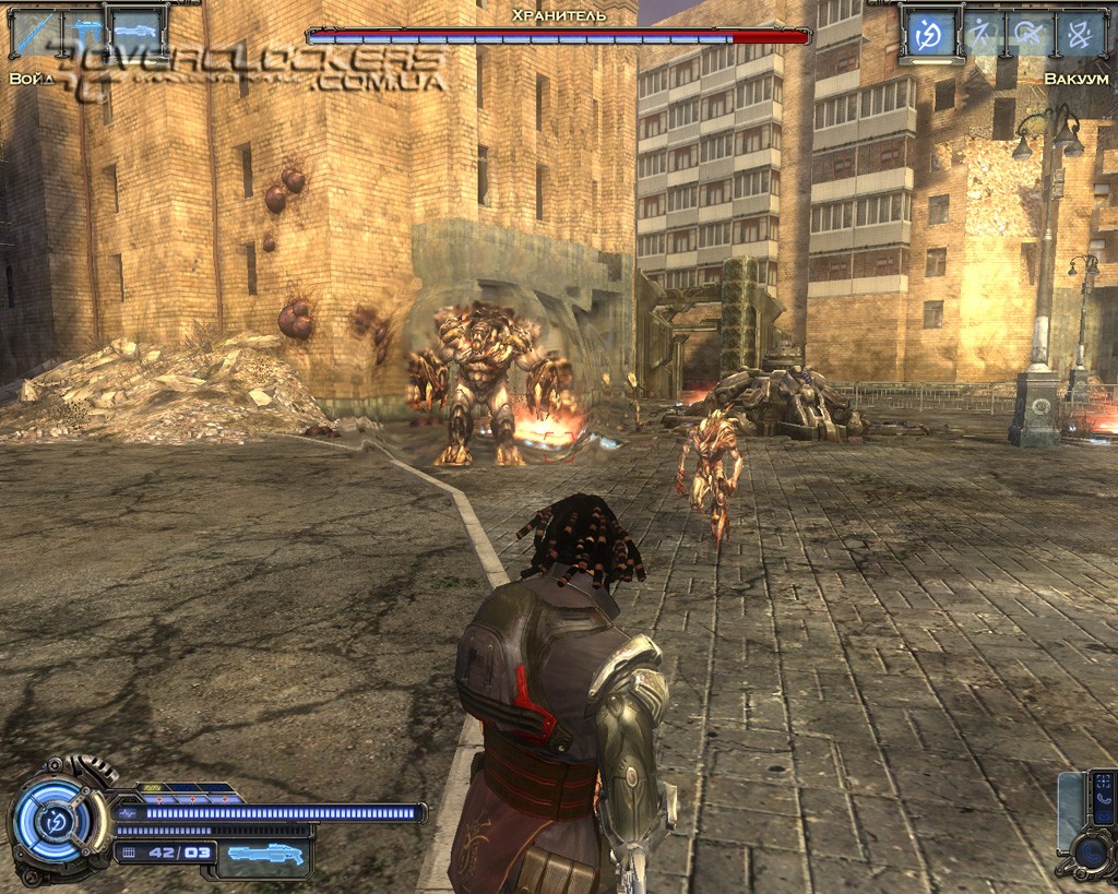 Игре после недавнего пришествия Devil May Cry 4 не избежать сравнений с детищем Capcom. Однако на самом деле общего у них немного. Взять хотя бы главного героя. Это вам не щупленький Данте на тоненьких ножках и с огромным мечом в два раза больше него самого. Наш Родан - типичный славянский типаж, сдобренный современными генными технологиями и африканскими дредами. Бугры мышц еле помещаются под обтягивающим костюмчиком, на ногах здоровенные металлические ботинки и бронированный наплечник с наручами. Для полноты ощущений этот образ рыцаря XXI века дополняется маленьким детским рюкзачком за спиной главного героя (надо же где-то боеприпасы хранить).