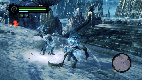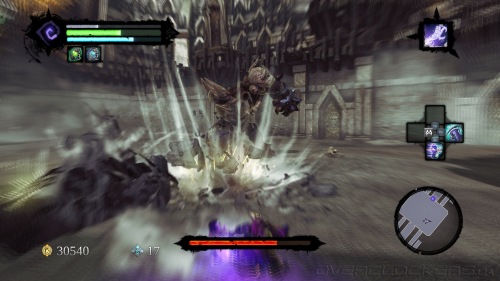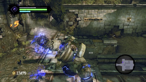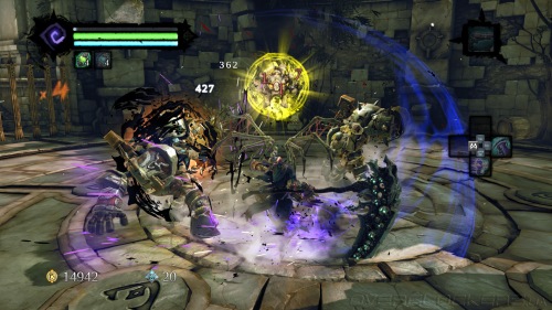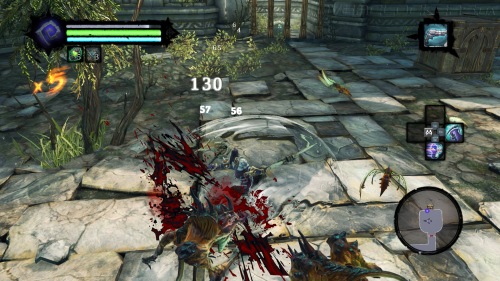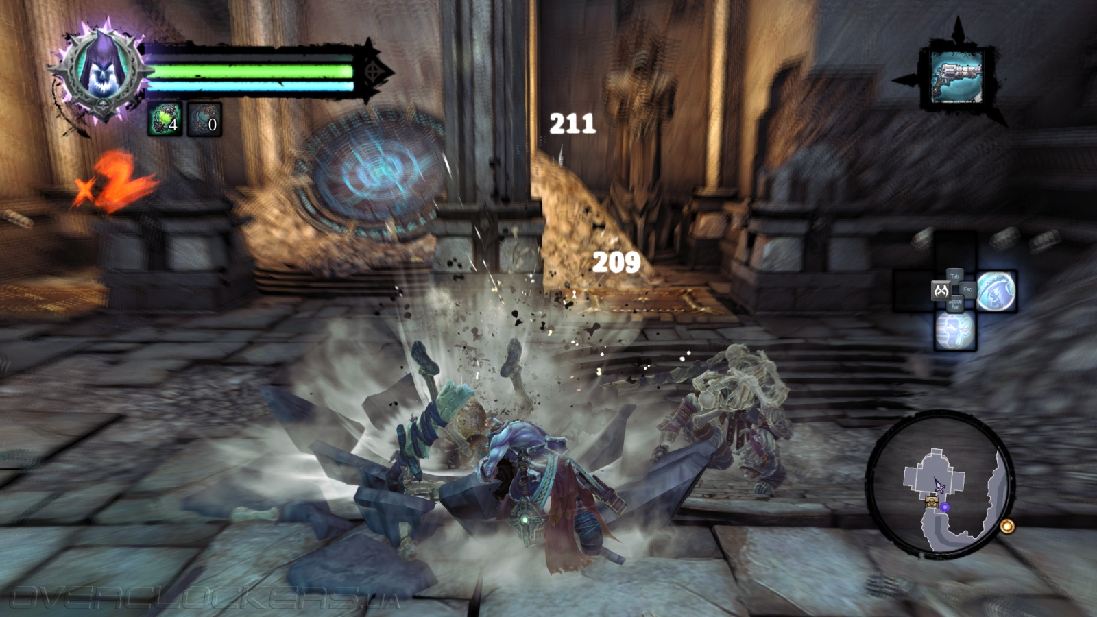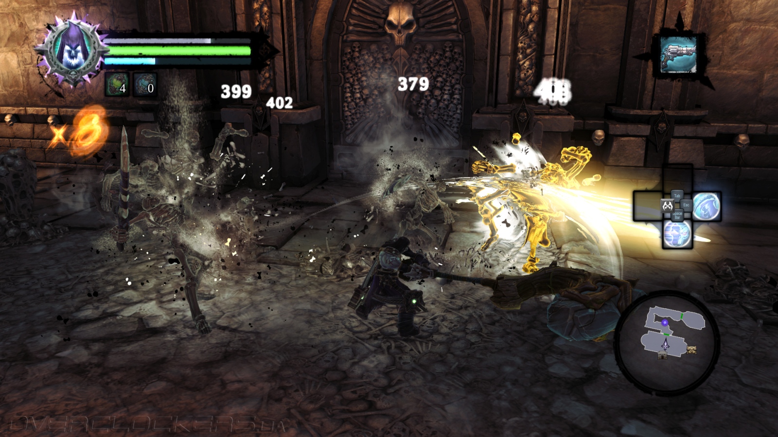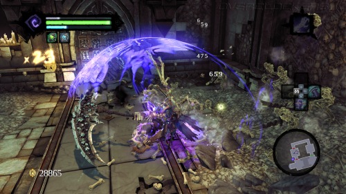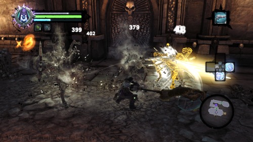 Но основное место в игре все же занимают битвы. Это динамичный слешер со всеми атрибутами жанра — обилием приемов, мощными комбо и яркими росчерками от взмахов оружия на экране. Движения нового героя более легкие и стремительные в сравнении с Войной, можно даже сказать, что они чуть грациознее. Уходить от ударов помогают перекаты. Быстрые удары наносятся косами, медленные и мощные — двуручным оружием. Впрочем, возможны и другие вариации. Арсенал очень разнообразен. На основное оружие всегда выбираются косы, но вот на альтернативное можно назначить как медленный молот и топор, так и очень стремительные когти. Так что каждый игрок сможет подобрать наиболее интересное и эффективное сочетание для себя. Естественно, что с каждым оружием Смерть управляется по разному и реализует разные комбо-удары. Последние покупаются нами за деньги у специальных учителей. Приемов очень много, они очень разнообразны и легко выполняются даже на клавиатуре. Это может быть сочетание последовательности нажатия одной клавиши, комбинация из уклонения и удара или одновременное нажатие двух определенных кнопок действия. По итогам Смерть будет швырять раскрученные косы, превращаться в волчка с лезвиями в воздухе, наносить мощные впечатывающие удары из прыжка и много чего другого. При этом скелеты и всякие големы охотно разлетаются на куски, брызжет кровь. Смотрится зрелищно и вполне в духе данного жанра.