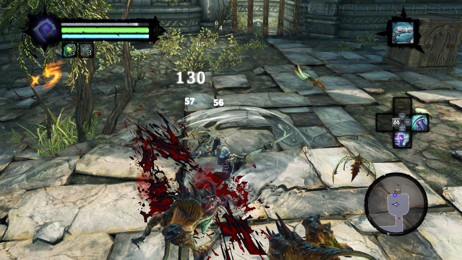 Есть у Смерти и особые спец-способности. Наш протагонист может выполнить круговой разворот, разбрасывая всех вокруг, или совершить мгновенный рывок за спину врага. В критический момент можно принять облик жнеца и отвесить по полной программе даже самому большому бугаю. Активируется все это легко, благодаря радиальному меню с паузой.