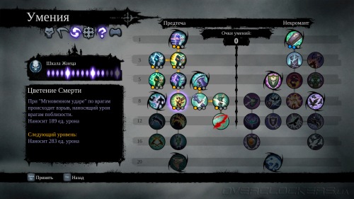И тут мы плавно подбираемся к еще одному важному моменту — ролевой системе развития нашего героя. Игра на проверку оказывается чуть ли не полноценным представителем жанра RPG. Есть две ветки развития персонажа. Одна дает магические способности, позволяющие открывать и улучшать свои особые приемы. Вторая ветка некроманта позволяет обучить Смерть призывать себе на помощь разных существ, повышать потом их стойкость и силу атаки. А еще в игре огромное количество оружия и доспехов. Различные ботинки, наплечники и накидки предлагают огромное количество комбинаций защитных и магических эффектов. Также дела обстоят и с оружием, которое дает бонусы к каким-то ударам или позволяет наносить дополнительные повреждения магическими эффектами. Что-то дает больший урон от обычного удара, но другое оружие повышает критический урон или восполняет жизнь и магию за счет смертей противников. Так что выбор не всегда прост и в инвентарь постоянно что-то кидается про запас. От излишков можно избавиться у торговцев. Тратить заработанные на продаже лута и найденные в путешествиях деньги есть на что — волшебные амулеты, новые комбо, восполняющие зелья. А вот оружейный арсенал у торговцев не самый лучший, самые примечательные экземпляры все равно попадают к нам в руки по ходу выполнения квестов. Часто какой-нибудь мощный молот служит призом на поверженного босса.