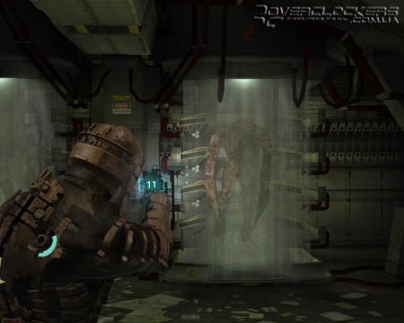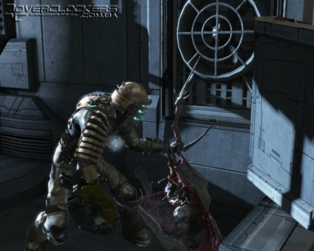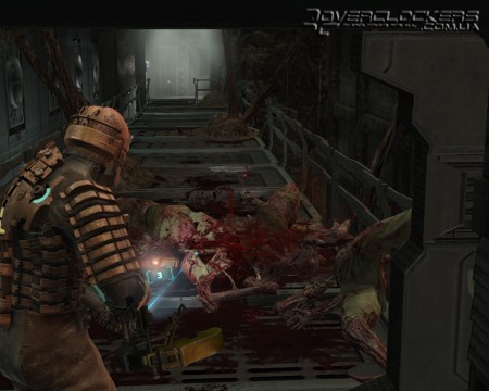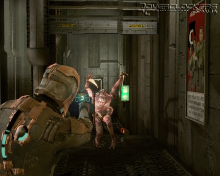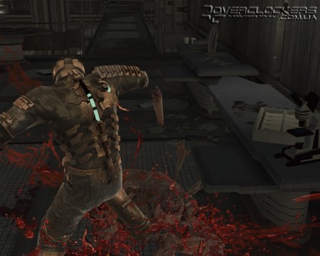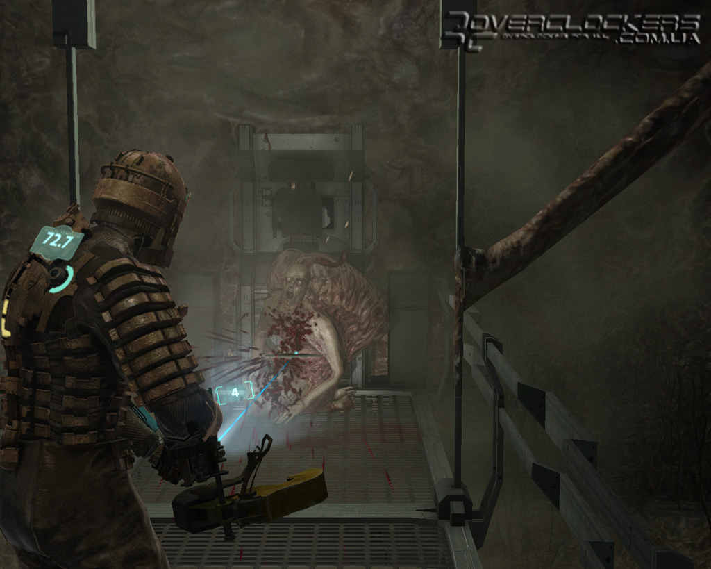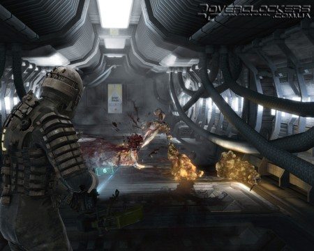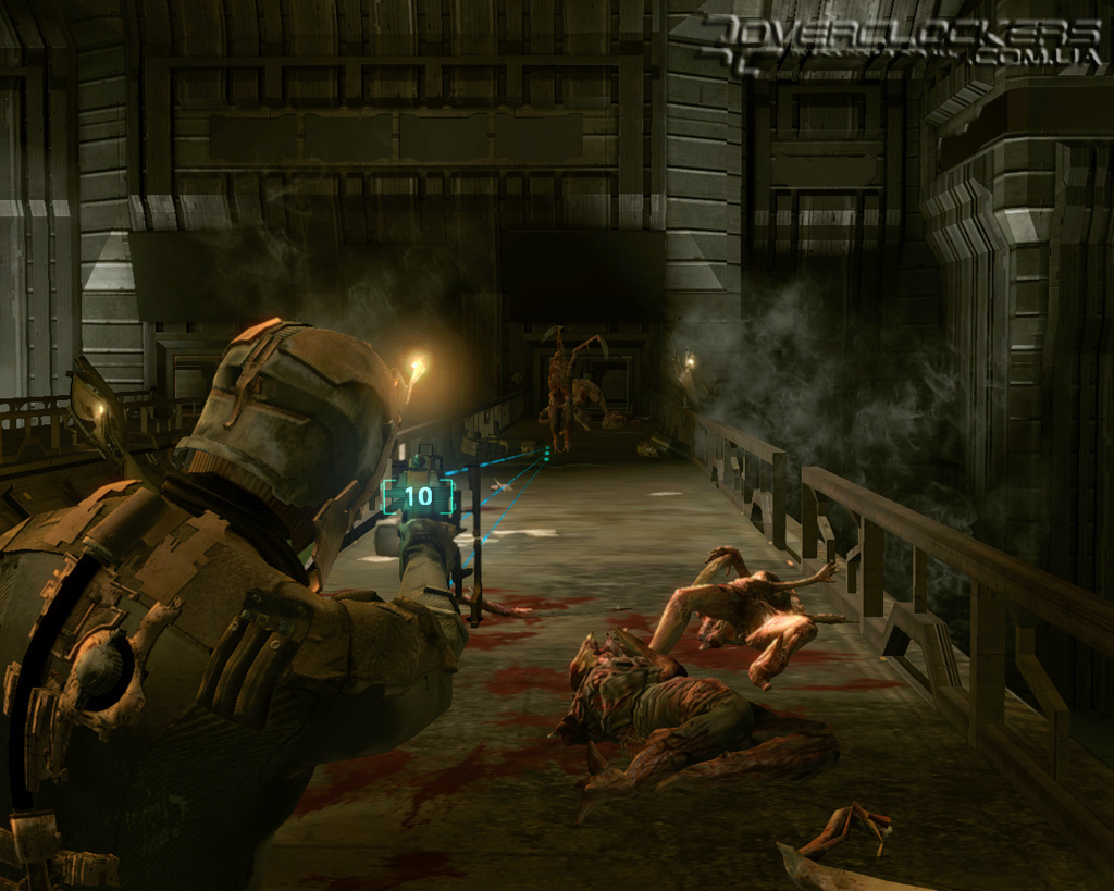 Захватывающий экшн играет злую шутку с horror-составляющей. К концу игра все больше скатывается чуть ли не к типичному шутеру, напоминая прошлогодний Clive Barker's Jericho. Теряющееся напряжение иногда еще усугубляется пробежками по одним и тем же территориям. Некоторые места придется посетить чуть ли не по три-четыре раза. При этом и FPS из игры выходит жутко неудобный из-за непонятной камеры. Мы постоянно наблюдаем слева спину героя, который прилично закрывает кругозор, и лишь в режиме прицеливания камера нависает над оружием. При этом прицел двигается лениво и в беге герой не стреляет. И если разобраться с парочкой монстров в коридоре это не мешает, то когда на большей площади они окружают нас, то сразу вспоминаешь «незлим тихим словом» кривобокое управление, бегая между ними, резко останавливаясь и бешено дергая мышку. Все же неприятно когда геймплей подстраивается под особенности управления, а не наоборот. Игрокам намного приятнее противостоять виртуальным противникам, а не бороться с системой контроля персонажа. Но в целом в Dead Space управление хоть и не идеально, но привыкнуть к нему не сложно. А вот чтобы избавиться от ограниченного кругозора, закрытого спиной героя, придется обзавестись широкоформатным монитором, на них этот неприятный эффект почти не чувствуется.