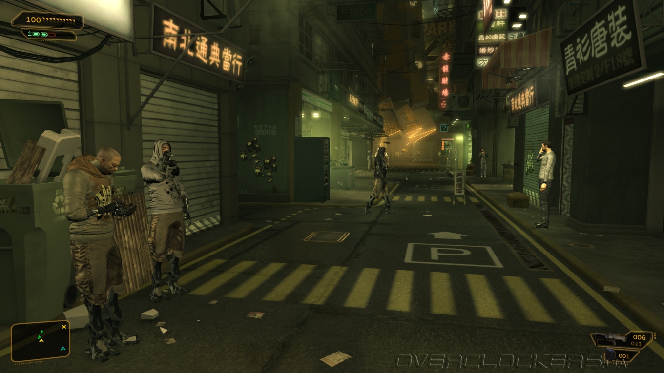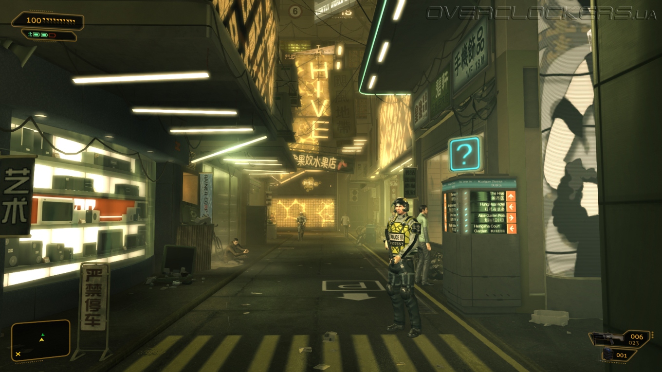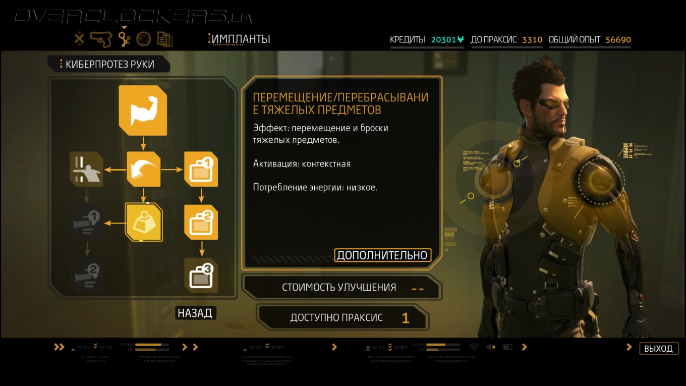 Выбор подручных средств для моих шпионских миссий тоже богат. Импланты и протезы дали мне большие возможностей, хотя не все они открыты сразу. Организму требовалось время, чтобы адаптироваться. Постепенно я привыкал, набирался опыта и улучшал свои возможности с помощью программного обеспечения «Праксис». Случайная подработка давала возможность излишки средств потратить на дополнительный «Праксис» в филиалах клиники Limb. Радар, отмечающий врагов, индикация их уровня тревоги и зоны видимости, рефлексы, позволяющие быстро вырубить врага голыми руками, броня и улучшение точности благодаря снижению отдачи — это лишь часть всего того, что позволяет новое тело. Временная невидимость и средство в купе с возможностью видеть сквозь стены позволяет быть более скрытным, повышение навыков взлома открывает доступ к компьютерам и замкам, улучшенные рефлексы помогут вырубать до двух противников за раз, модернизированные легкие позволят бегать быстрее и будут фильтровать вредные газы, электрогравитационная система торможения смягчит прыжок с любой высоты и при этом еще оглушит врагов. Шариф даже встроил в меня боевую систему «Тайфун», выстреливающую круговые взрывающие заряды. А в магазинчиках на черном рынке еще можно прикупить несколько улучшений для обычного оружия — увеличить урон, емкость обоймы, скорость перезарядки или поставить глушитель на пистолет и винтовку.
