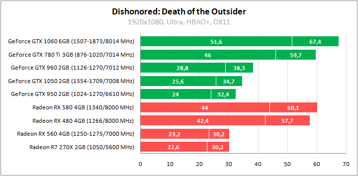 О комфортном игровом процессе можно говорить при наличии видеокарт уровня Radeon RX 480 или GeForce GTX 780 Ti. Общее преимущество на стороне моделей NVIDIA. GeForce GTX 1060 быстрее Radeon RX 580 на 12–17%. Игра отличается чрезвычайно высокими требованиями к видеопамяти, ей нужно не меньше 4 ГБ.