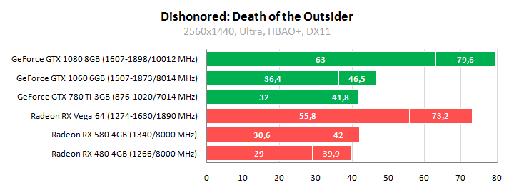 GeForce GTX 1060 хорошо справляется даже с разрешением 2560x1440, Radeon RX 580 такой режим дается с трудом. Высокий fps в высоком разрешении легко обеспечат GeForce GTX 1080 и Radeon RX Vega 64. С последними можно замахнуться и на 4K, но при некотором снижении настроек.