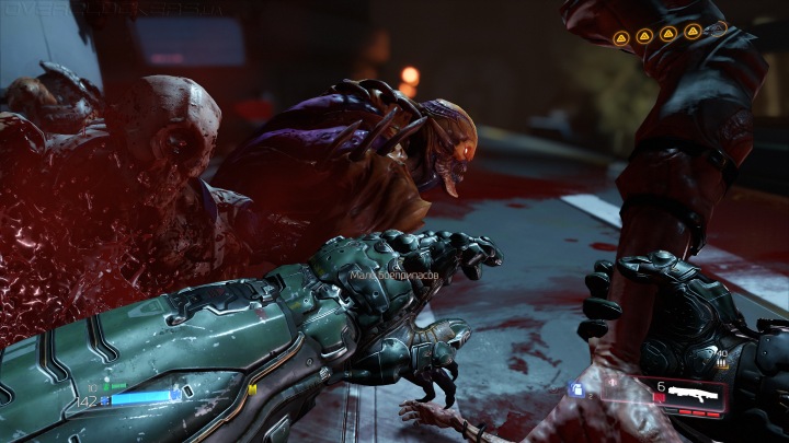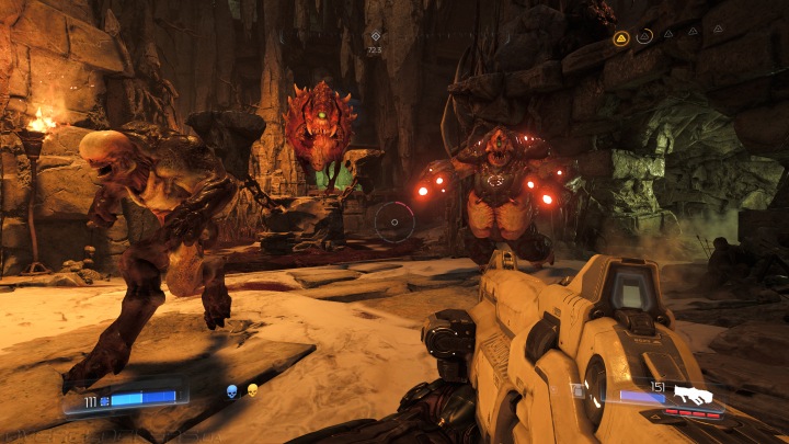 Постоянный бег и оружие без перезарядки сразу намекают на бодрый темп перестрелок, который по ходу игры только нарастает. Движение — жизнь! В этом вся суть DOOM. Монстров много, они бегут с разных сторон, плюются огнем, стреляют из оружия или просто сносят все на пути во время пробежек. Приходится быстро лавировать между ними, не забывая поливать огнем из всего своего арсенала.