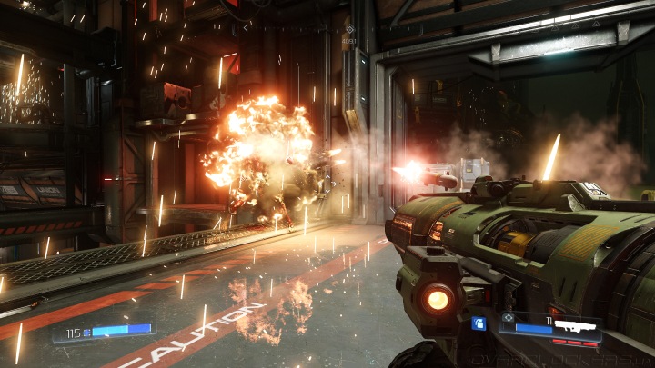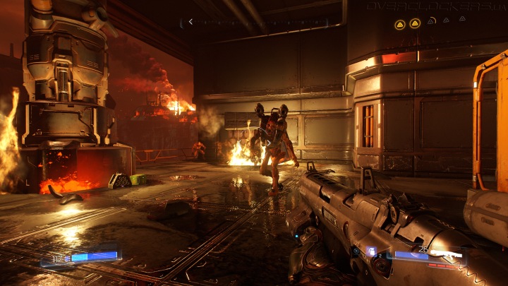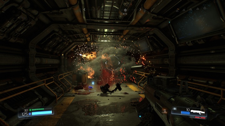 DOOM часто выглядит более эффектно в динамике из-за множества ярких вспышек и обилия частиц с множественными кровавыми ошметками. Бывает, что когда доходит до боя, то невзрачный вроде бы уровень просто расцветает. А если в нем изначально много отражающих стен, то стрельба быстро превращается в яркое шоу.