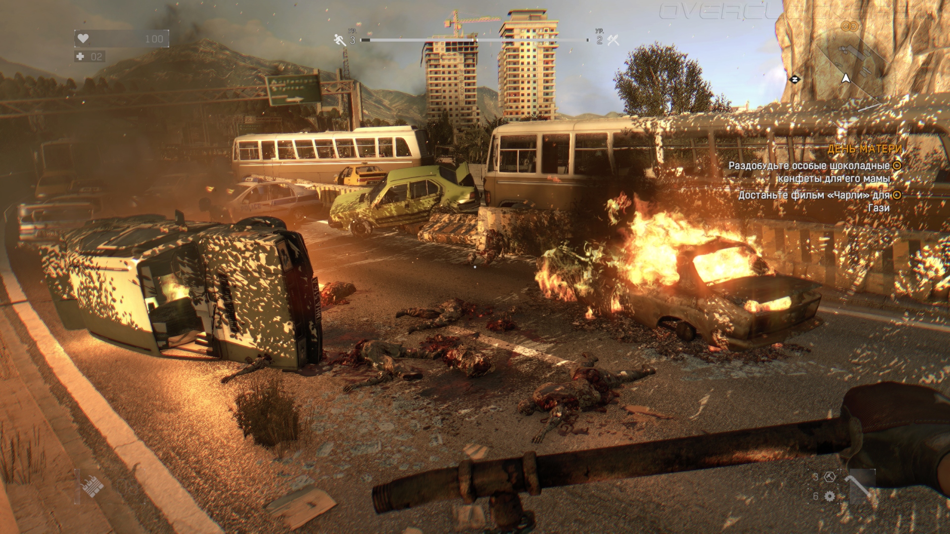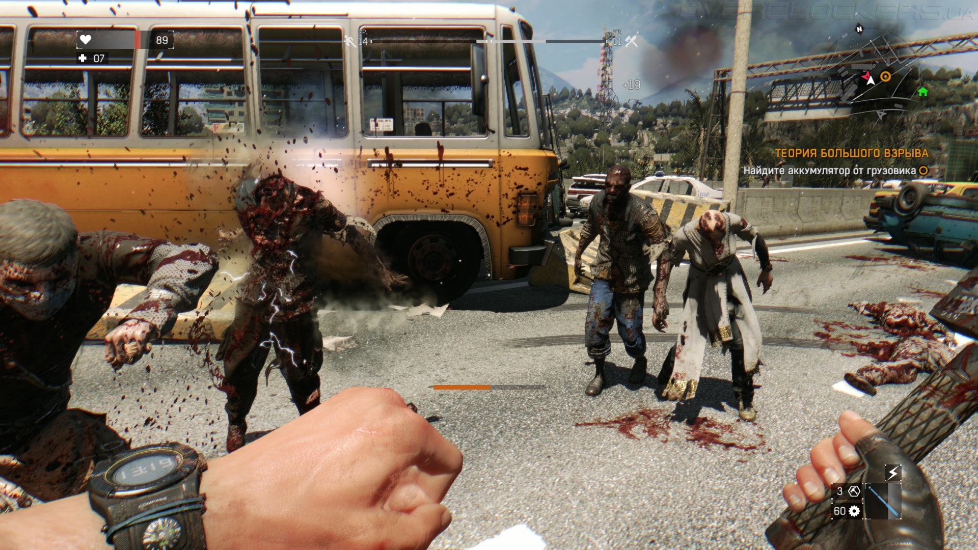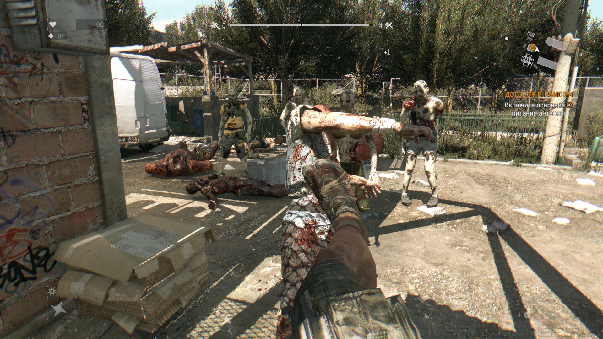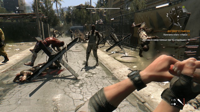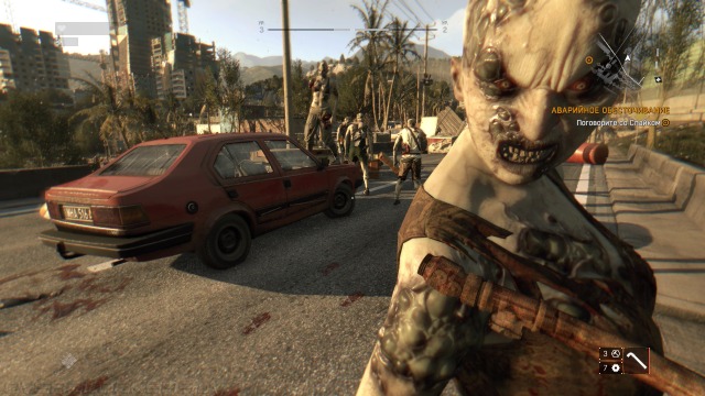 Боевая система напоминает Dead Island, но играется бодрее. Мутузить зомби можно различными дубинами, кусками трубы, ножами и прочим холодным оружием, а можно и дубасить ногой. Есть подкат на бегу и удар в прыжке, который позволяет оттолкнуть врага. Если повезет, то таким толчком можно скинуть мертвяка с крыши или насадить на какие-то шипы (подобных заграждений в игре хватает). Оружие по-прежнему подвержено износу, но служит дольше. Теперь вопрос замены дубин или ножей возникает не из-за того, что они быстро рассыпаются в прах, а потому, что попадается что-то более мощное и интересное. Ну и любое оружие можно несколько раз отремонтировать, что тоже избавляет от излишней горячки постоянно поиска чего-то нового.