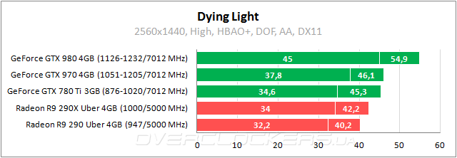 При максимальном качестве графики в разрешении 2560x1440 уверенно лидируют графические решения NVIDIA. Даже старый флагман GeForce GTX 780 Ti оказывается лучше Radeon R9 290X. Новые GeForce еще быстрее. Примечательно, что в таком режиме игра легко загружает до четырех гигабайт видеопамяти. Однако особых преимуществ представителям AMD на фоне старичка GeForce с 3 ГБ это не дает.