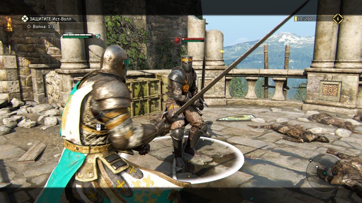 Боевая система предусматривает два режима. Можно прямо во время бега сочетать разные типы ударов и проводить более мощные комбинации. Но в стычке с мощными бойцами приходится использовать боевую стойку, которая позволяет эффективно защищаться и парировать удары. Для блокирования нужно выбирать одну из трех позиций, а направление вражеского удара подсвечивается красным указателем. Все понятно и просто, но это поначалу. Герои по-разному выполняют блок, кто-то долго удерживает оружие и щит в защитном положении, а некоторые могут остановить удар лишь в момент своевременного выполнения блокирующего приема.
