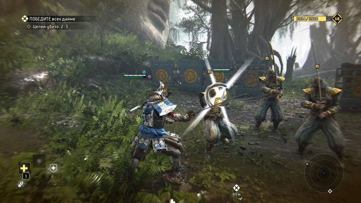 Есть еще такой момент, что из-за концентрации на указателе блокирования в центре экрана сложнее уследить за действиями врагов вокруг. И если врагов много, то реагировать на них сложнее. Удары сочетаются с маневрами и оглушающими толчками. Все это надо контролировать, отбивать, наносить ответные удары и быстро менять цели.