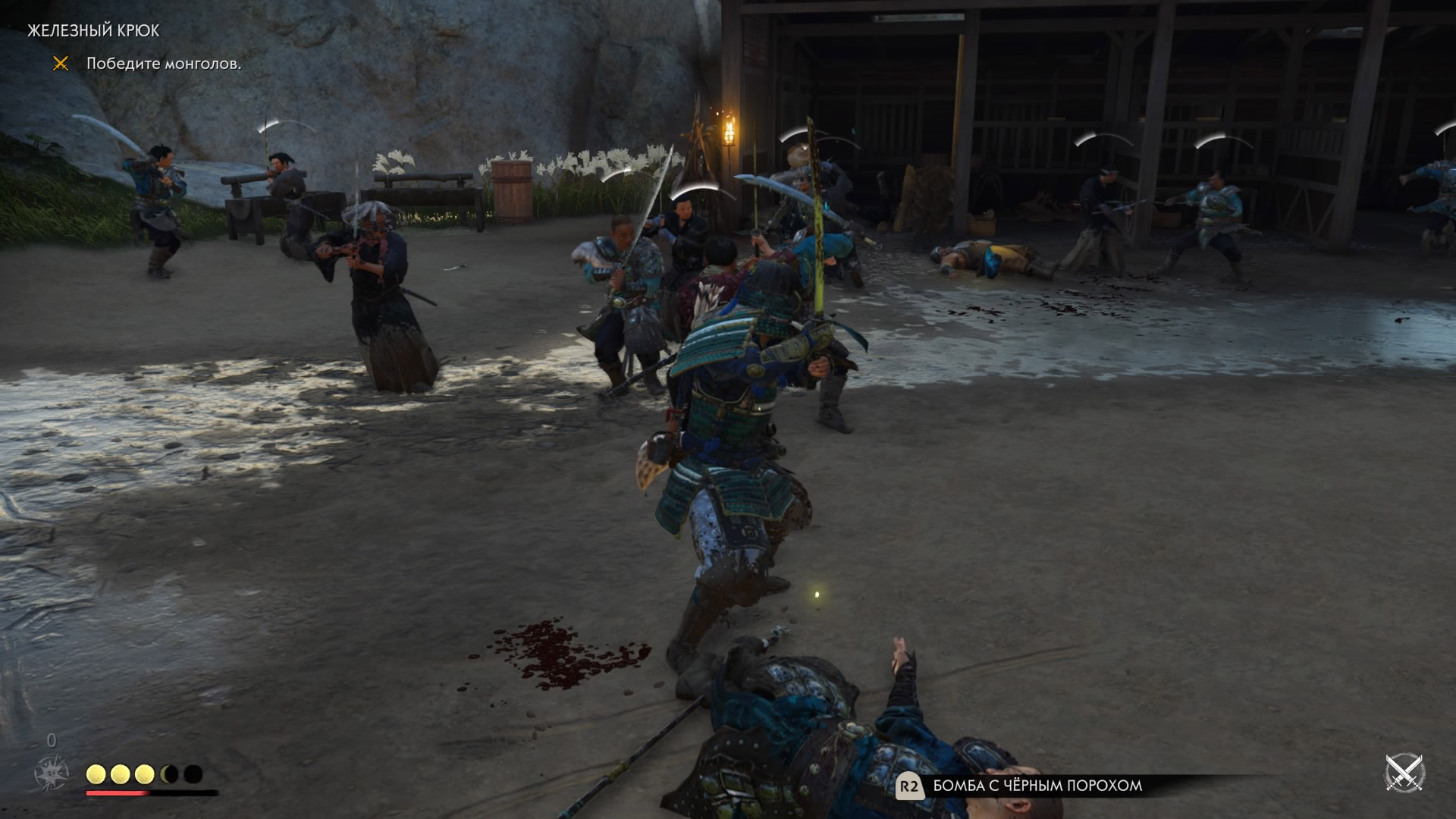 Ghost of Tsushima не хардкорная игра по типу Sekiro, но тут просто не будет. Даже на среднем уровне одолеть пяток врагов за раз выйдет не с первого раза, а при наличии главаря и пары лучников задача становится еще труднее.