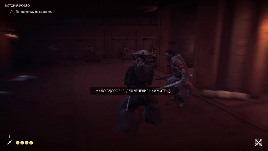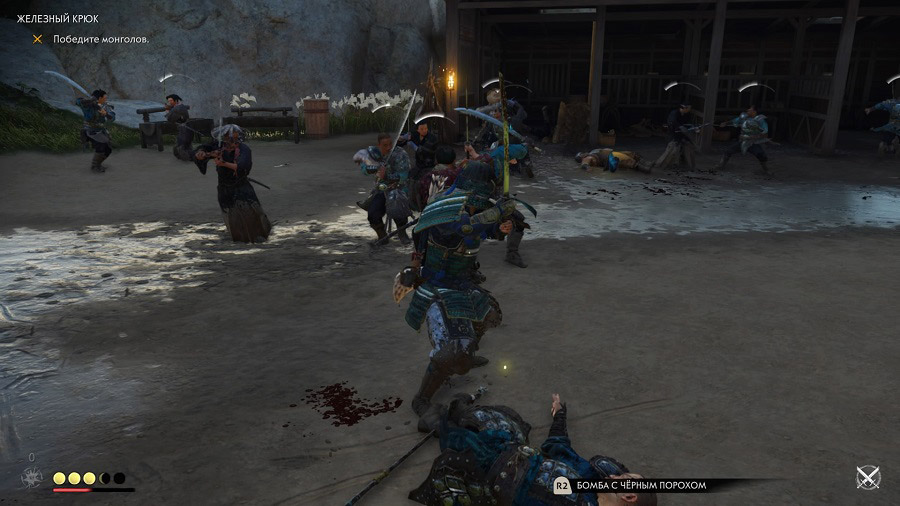 При удачном парировании в последний момент монгольского супостата можно убить одним эффектным ударом. Как вариант — пережидаем под блоком серию выпадов и атакуем в ответ. Но для этого также придется пробить вражескую защиту, обозначенную знакомой по другим играм шкалой над противником. Враг умеет атаковать и суперударами, обозначенными красными или синими вспышками. От первых можно легко уклониться и тут же атаковать сбоку, а вторые позже разрешат блокировать, открыв специальное умение.