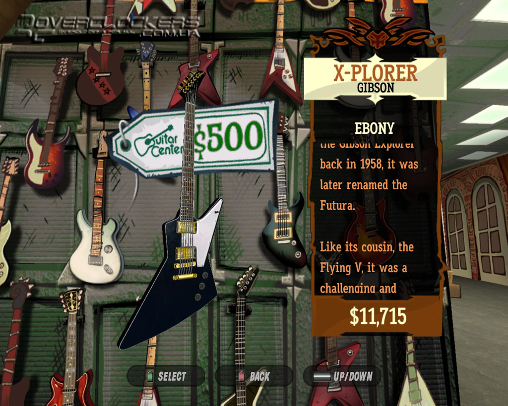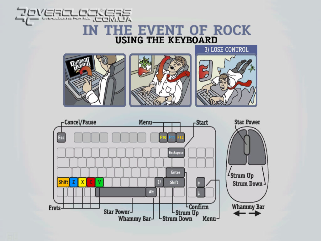 Как видите, никаких струн на ней нет. На манипуляторе, пять кнопок на грифе играют роль пяти ладов, а для удара по струнам есть отдельная кнопка. Локализованная версия с таким «джойстиком» издается компанией «Новый Диск». Стоит такое удовольствие конечно недешево, но всегда можно взять простое издание без гитары и обойтись обычной клавиатурой.