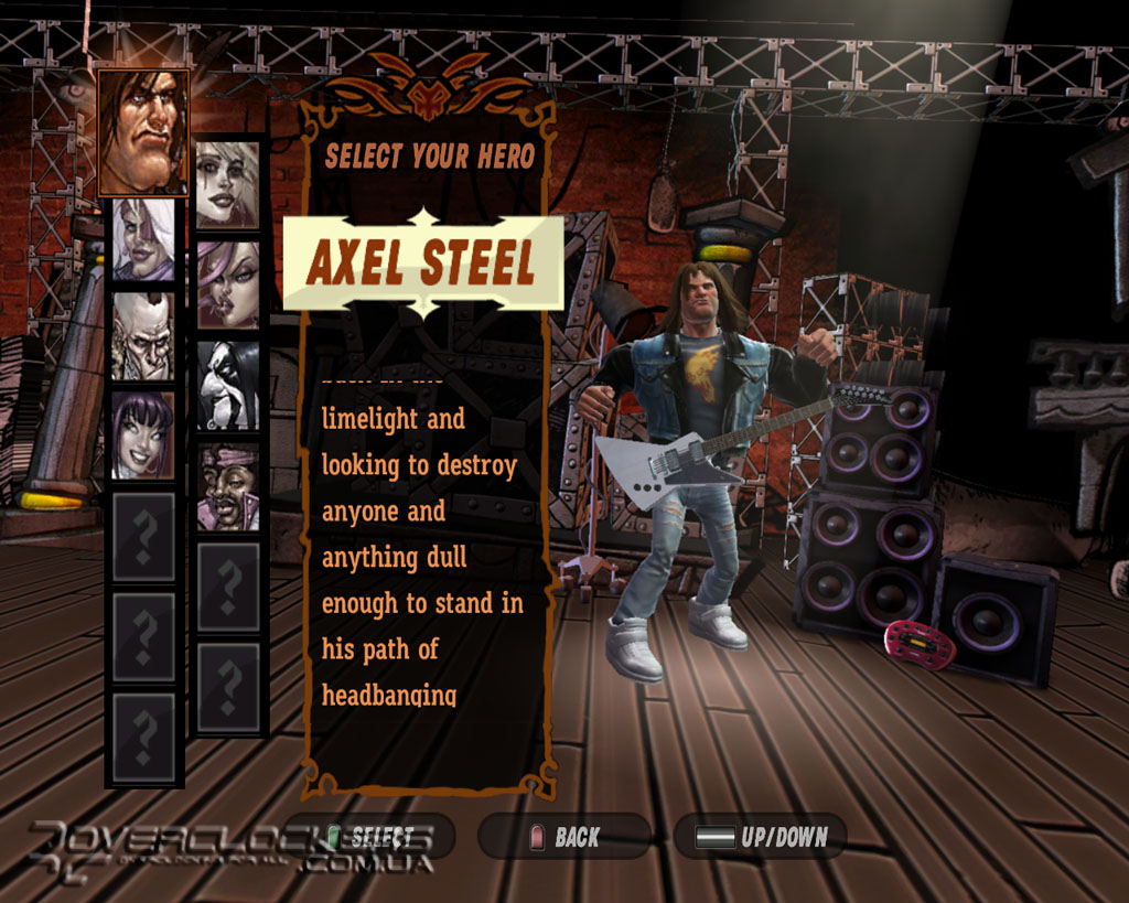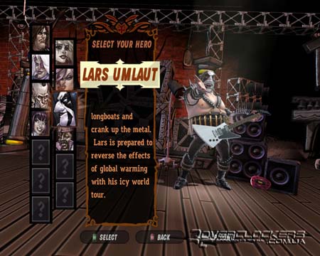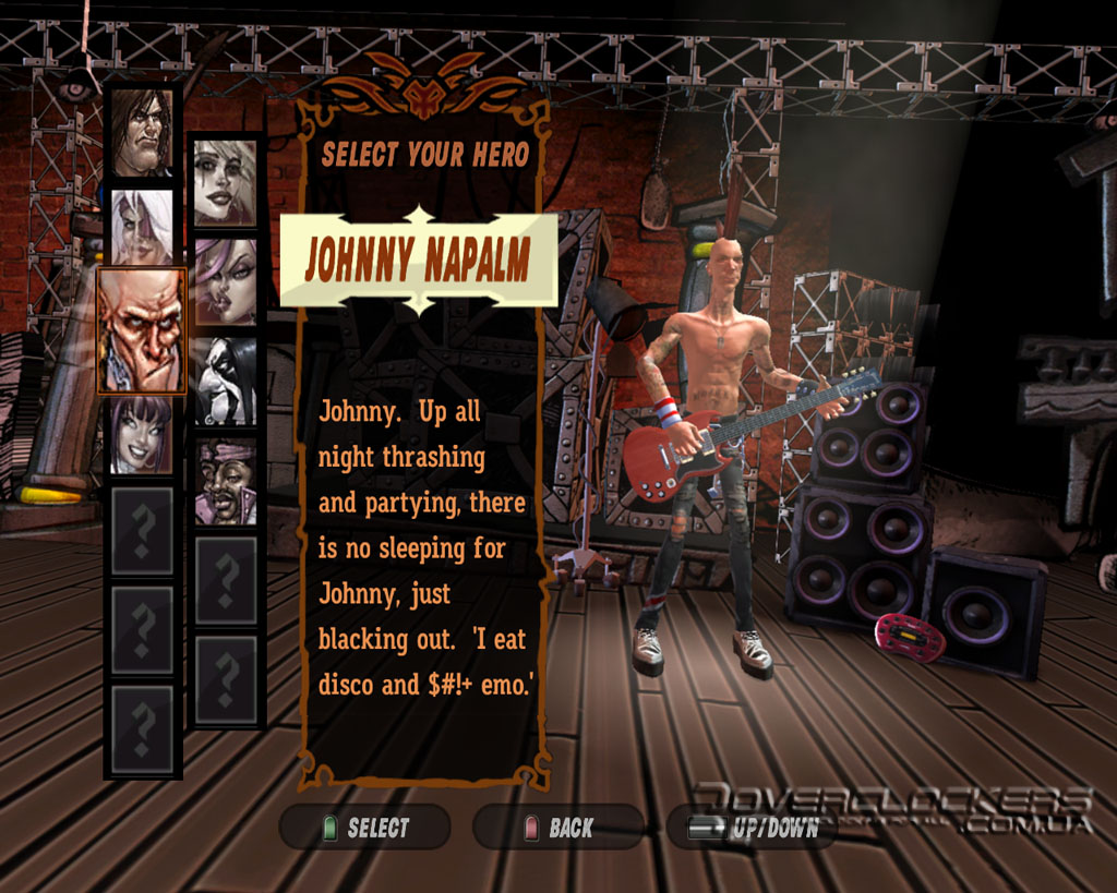 Из нескольких необычных и забавных персонажей мы сможем выбрать себе героя на любой вкус. Как и сама игра, персонажи представляют самые разнообразные слои рок-культуры. Тут вам и здоровяк в традиционных рваных джинсах, и размалеванный парень в стиле «унисекс».