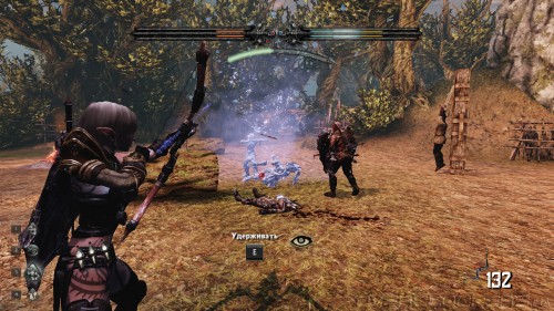 Стрельба из лука возможна в режиме точного прицеливания (выбранная позиция камеры не самая удобная) и при автонаведении. Во втором случае вам остается лишь уклоняться от ударов и не забывать нажимать кнопку огня, поворачиваясь в сторону нападающего.