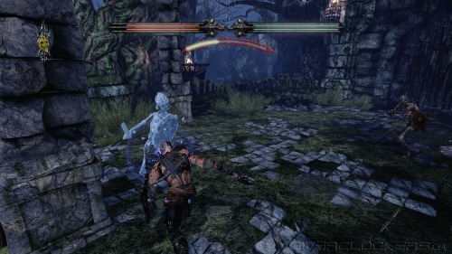 Мрачный антураж, готические строения и классические монстры предполагают, что меч — основное оружие. На самом деле, это не так. Играть воином даже не так интересно, как лучницей: всего-то два удара и блок. Боевка довольно простая, нет никаких хитрых комбинаций клавиш. Но в запасе у каждого из напарников имеется магия, причем одна школа магии общая, а вот оружейная магия уникальна для каждого. Но школы включают всего-то по три заклинания. Каддок может входить в режим ярости, делать мощный рывок, валящий с ног, или поднимать ближайших врагов в воздух, превращая их в отличную мишень для стрел напарницы. Э’лара имеет на вооружение взрывающиеся стрелы, замораживающие и пробивающие броню. Молнии, защитные знаки и серные снаряды можно открыть у любого героя.