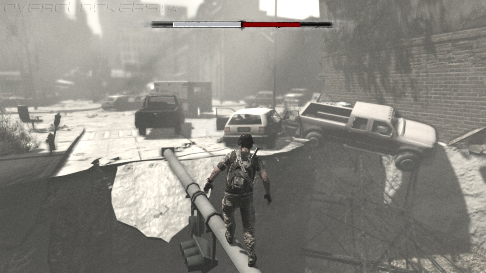 Игра строится на выживании как таковом. Для этого нам нужно поддерживать в нормальном состоянии полоску жизни и выносливости. Причем второй параметр играет не менее важную роль чем первый, ведь выносливость расходуется на любое действие в игре — бег, прыжки, карабканье по вертикальным конструкциям. Если вы исчерпали запас сил во время подъема по стене — полетите вниз. Если выдохлись при беге — начнет уменьшаться здоровье. Сделать последний рывок из последних сил можно, выиграв простенькую мини-игру по быстрому нажатию кнопки мыши. Задачу заметно усложняет едкая пыль, окутавшая город после разрушения строений. Эта плотная пылевая завеса окутывает все нижние слои и само нахождение в ней истощает нашу выносливость даже без каких-то движений. Так что при передвижении по городу нужно периодически искать возвышенности для восстановления сил или восполнять их при помощи воды с едой. Провиант мы будем находить в самых разных местах и закоулках игровых локаций. Обычные средства лечения тоже имеются, но попадаются не так часто.