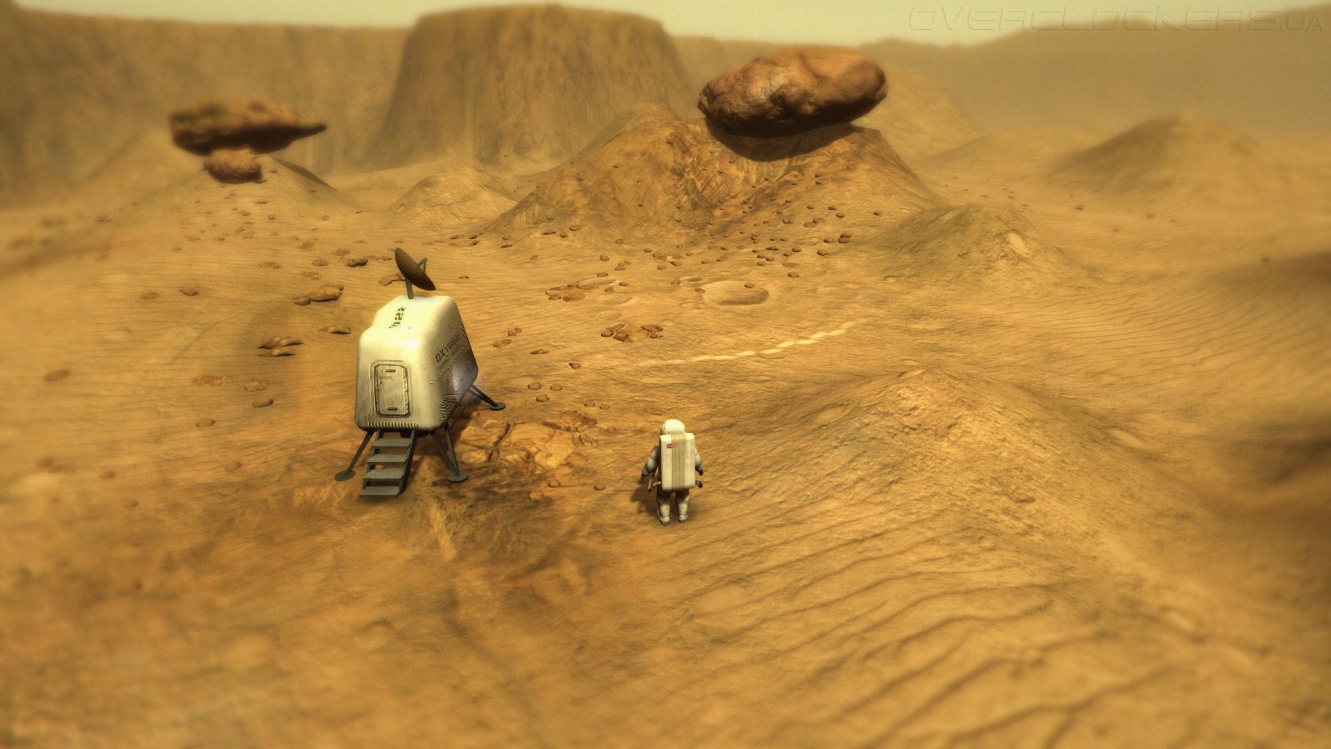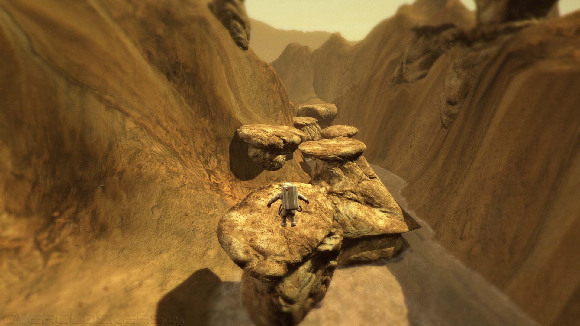 С этой простой задачи и начинается наше путешествие по неизвестной планете. Вереница следов приводит к еще одному модулю, где удается пополнить запасы кислорода, а потом уходит в горы, где начинает петлять по долине, заставляя более тщательно выискивать след и прыгать по крупным камням.
