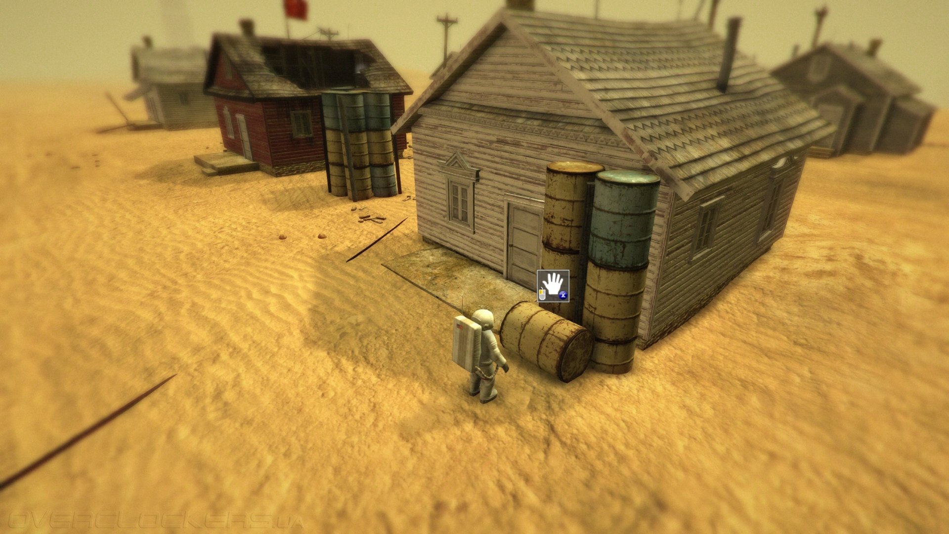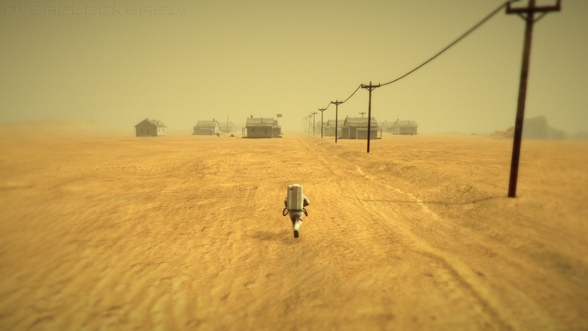 По мере того, как позади нас остается все больше этих столбов, из песчаной дымки возникает еще более сюрреалистичное зрелище — старый брошенный поселок с обветшалыми домиками и красным советским флагом в центре. Вот те раз! А мы то здесь не первые. Но кто они, эти неизвестные покорители космических далей из нашего прошлого? Не мираж ли это? Возможно, за всей своей напускной пустотой и мертвенной желтизной планета скрывает еще большие секреты, до которых остается несколько шагов. Теперь дело за вами. Идите вперед, а мы вежливо промолчим о тех открытиях, что вас ожидают.