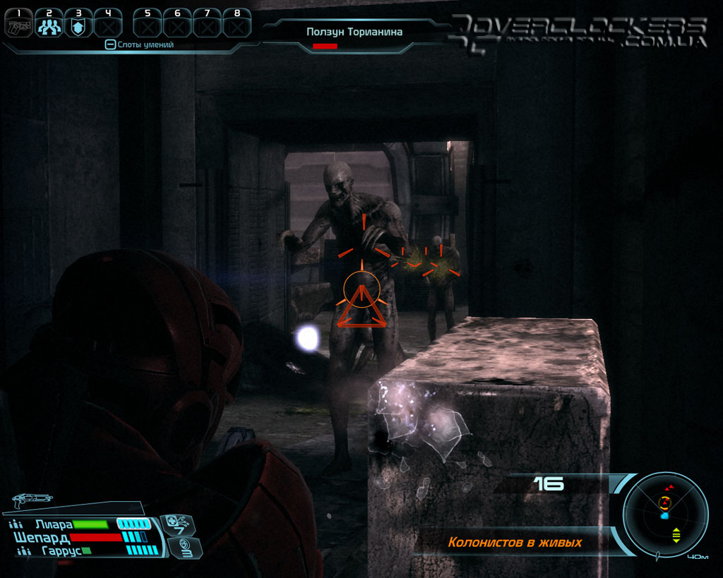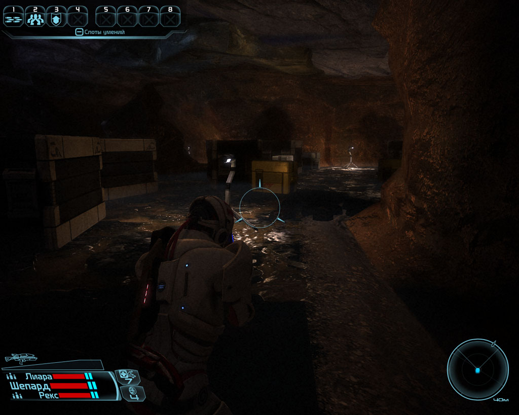 Но в отличие от того же KOTOR, мы даже не можем указать, кого конкретно атаковать. Товарищи действуют по своему усмотрению. Справедливости ради, стоит отметить, что их "шутерный" интеллект иногда довольно грамотный, если они заметили противника, то и спину вам прикроют и поддержат своими спец-способностями. Для управления отрядом у нас есть несколько стандартных команд в реальном времени - атаковать, удерживать, сгруппироваться. Во время паузы лишь щелкаем по иконкам способностей, а наши спутники уже сами выбирают цель. Есть способности, для которых это не удобно. Например, если указать напарнику использовать телекенетический толчок в пустое место, он туда его и использует. Так что необходимо словить цель в прицел а потом жать паузу. Самое обидное, что кнопку паузы еще надо и постоянно удерживать. С другой стороны, полно умений общего воздействия (разрушение щитов, обездвиживание близлежащих врагов и прочее), для которых цель указывать не надо.