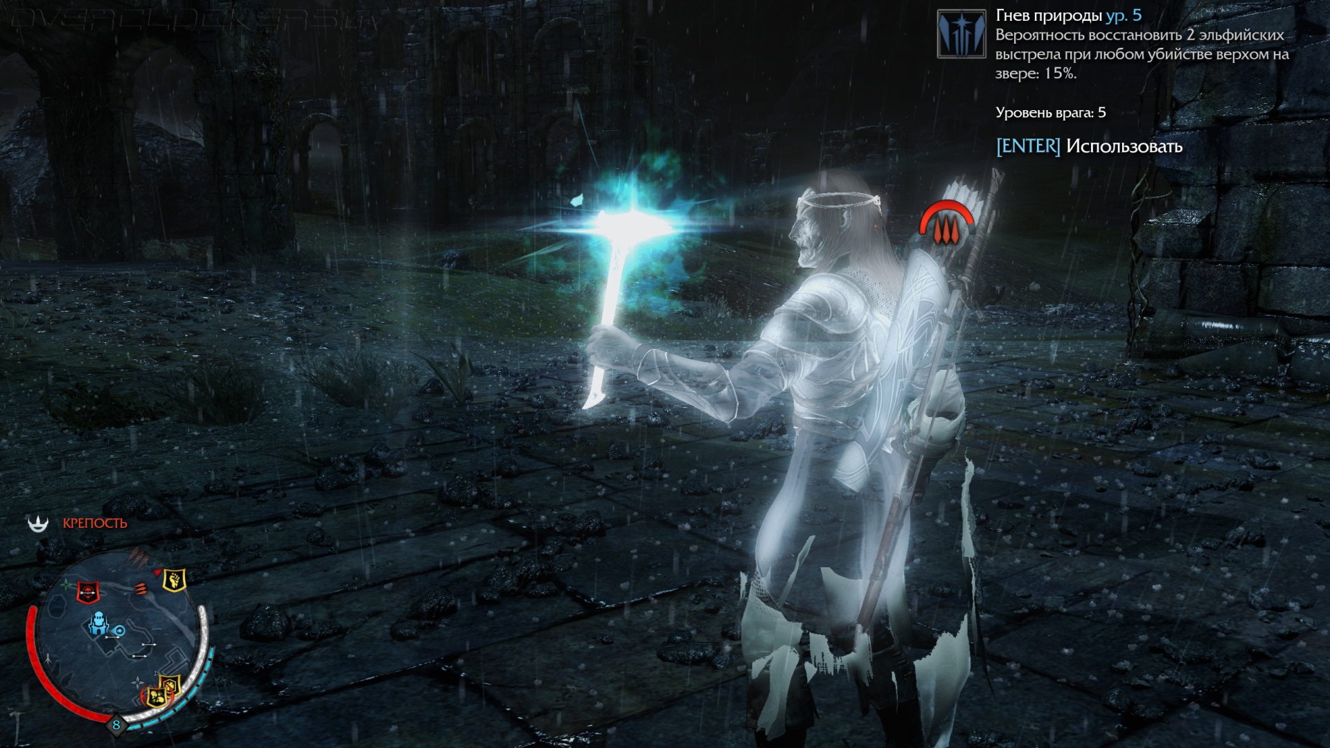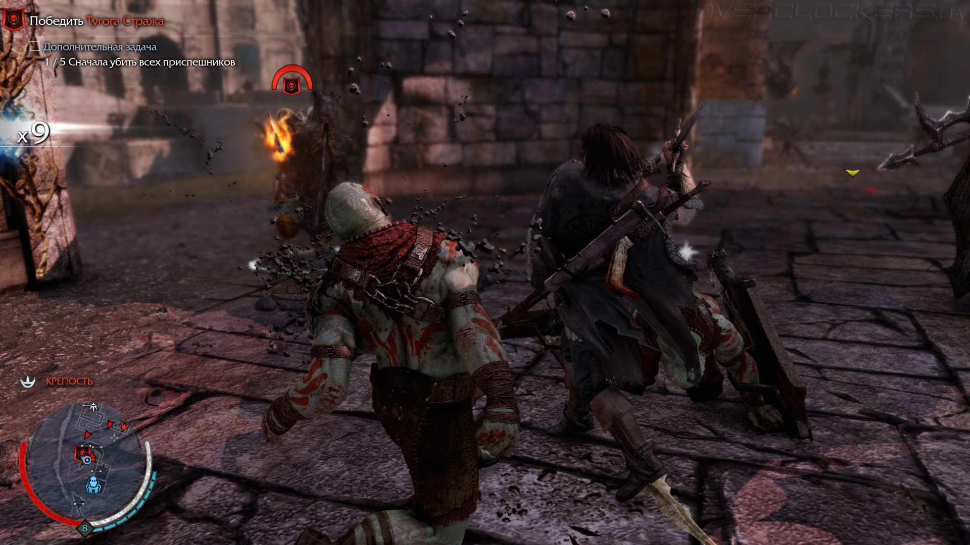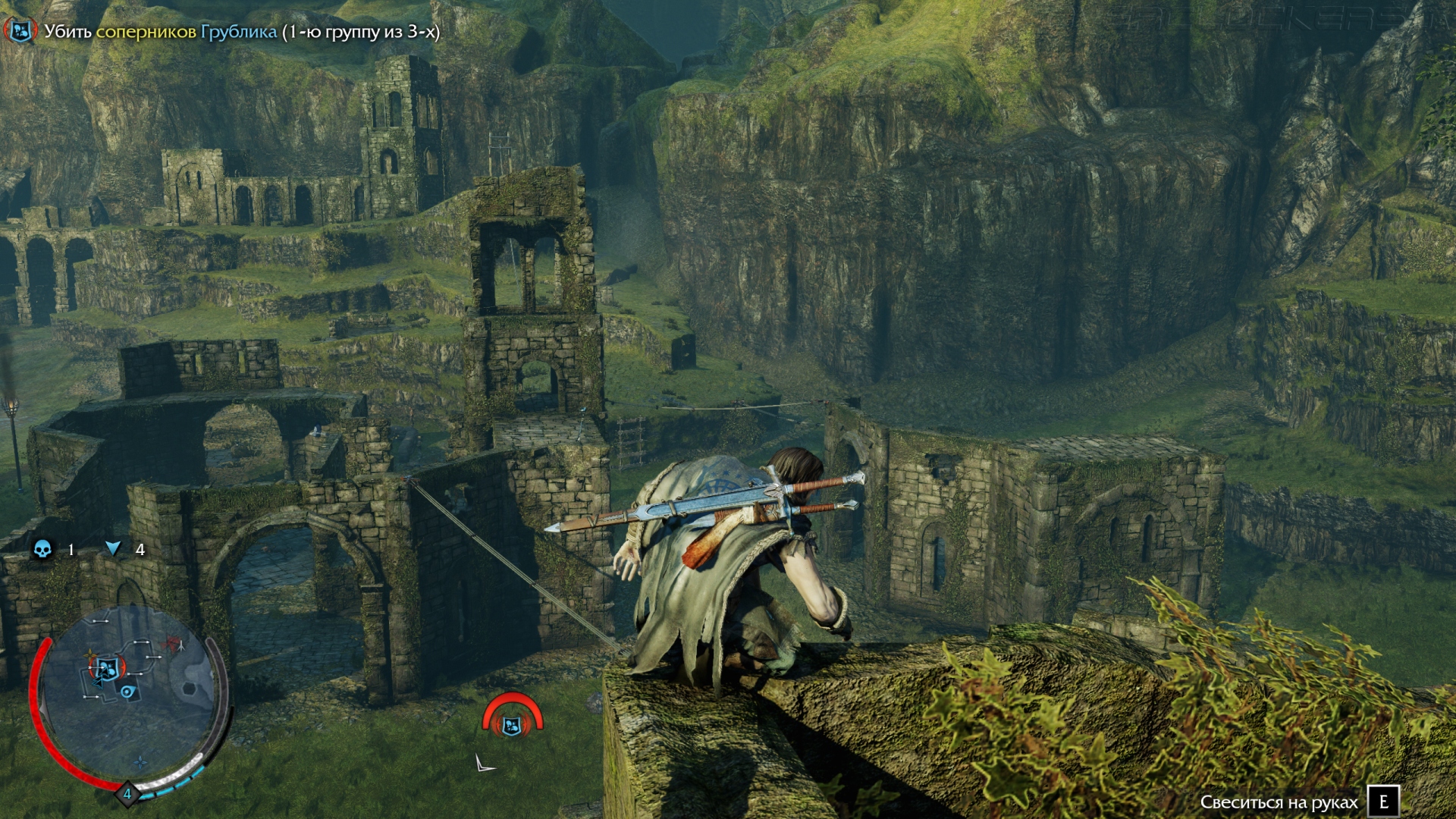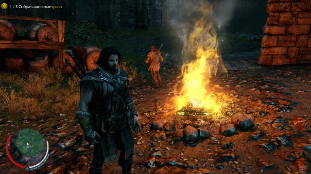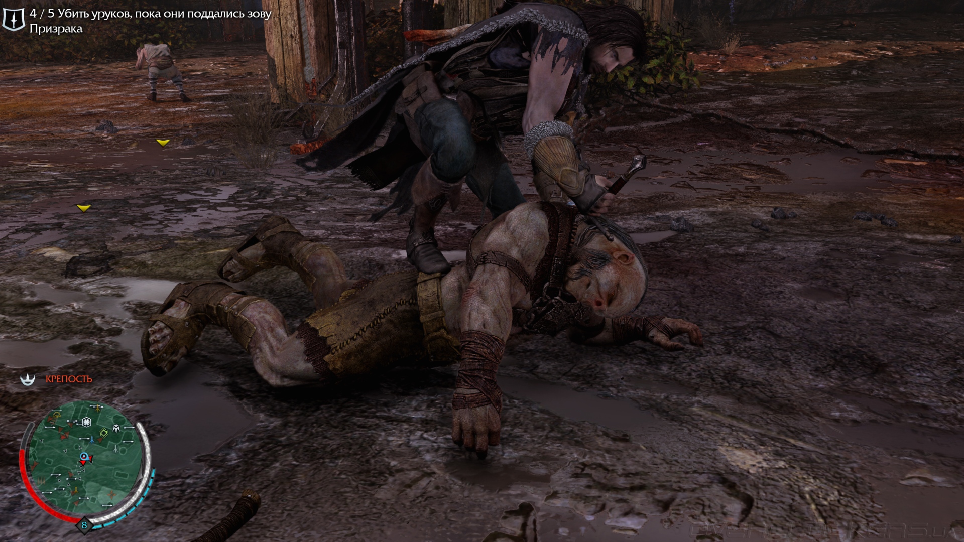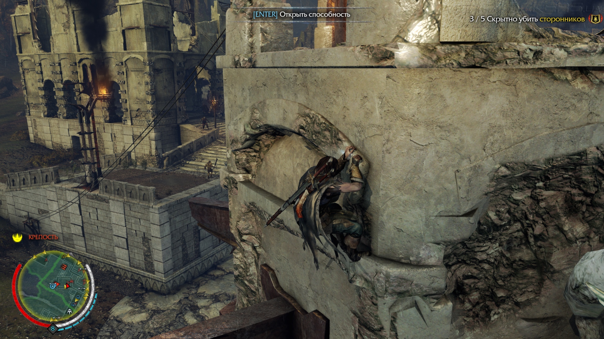 Аналогии с Assassin’s Creed возникают и благодаря сильному элементу скрытности. Только тут это реализовано не так убедительно, но и первоочередная роль стелсу не отводится. Многие задания можно решить в открытом бою, но тихая тактика требует меньше затрат времени и нервов. Талион умело карабкается по любым стенам, что позволяет обходить уруков с верхних позиций и нейтрализовать отдельных из них смертельным ударом в прыжке. На земле скрыть нас помогают кустарники. Имеет место некая близорукость противников и замедленное время реакции, что в данном случае только на пользу общему балансу из-за большого количества врагов и быстрому их возрождению. Игра слишком уж охотно генерирует новых уруков. Вроде только что убил одну их компанию, отвернулся, взглянул назад — а на их место уже идет новая группа. На этом фоне весьма забавно выглядит ситуация, когда все территории обезлюдивают во время начала сюжетного задания, пока герой с напарником бредет по пустошам до нужной точки.