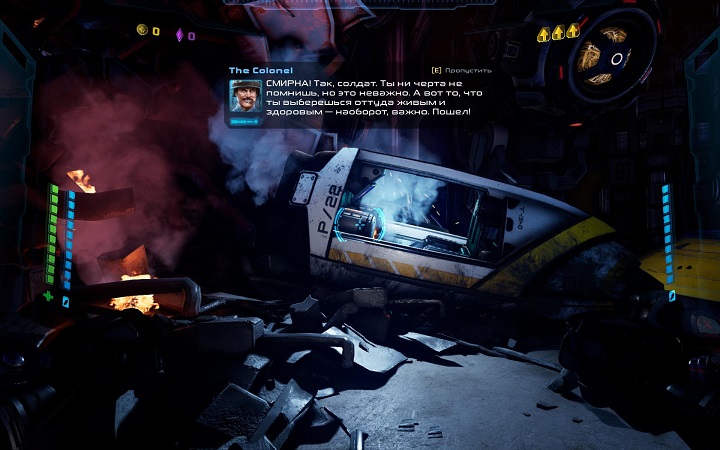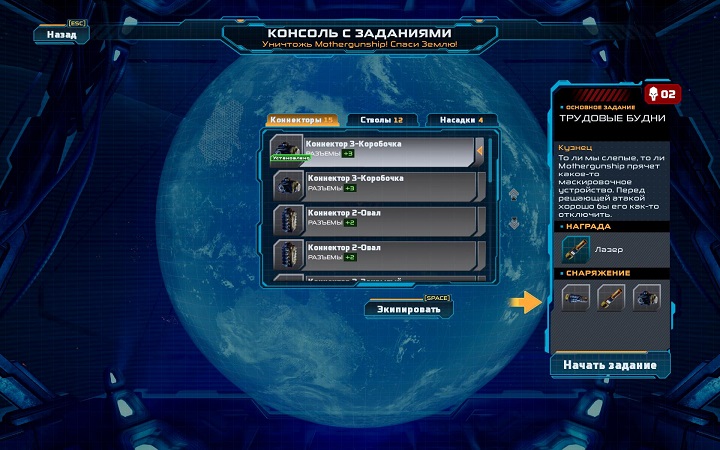 И конечно, для этой миссии выбирают неопытного геймера. Полковник, его помощница и печальный робот вводят игрока в курс столкновения, выделяют настоящую космическую базу (все равно почти всех убили и пустой жилплощади много), дарят военный экзоскелет, стартовый набор модулей для оружия и отправляют на «простейшее» задание — уничтожить материнский корабль и спасти человечество.