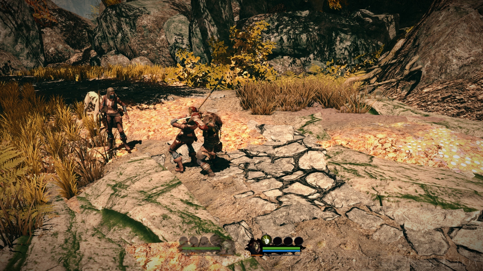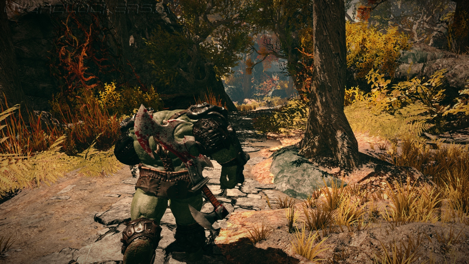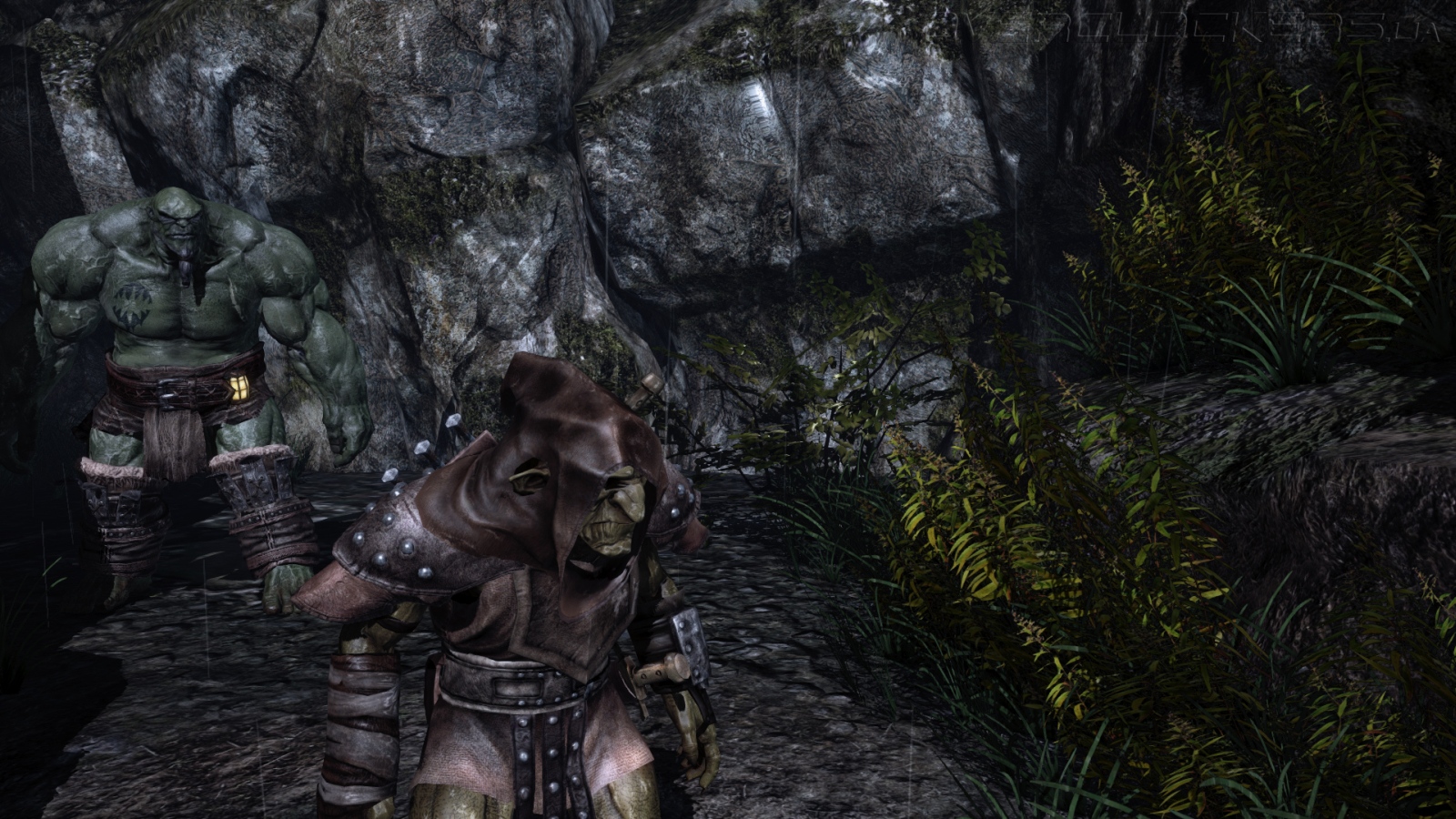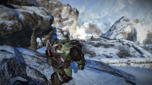 Игра пытается быть мрачной, поэтому большинство локаций — подземелья и какие-то грязные дождливые улочки, наполненные лужами, рельефными мокрыми поверхностями, игрой света и тени. Но все равно любоваться в темных коридорах зачастую нечем. Так что первая половина игры никаких положительных эмоций не вызывает. И лишь когда нас наконец-то выпускают на свежий воздух, демонстрируя горные пейзажи и осенние панорамы с золотистыми рощами, понимаешь, что игра может выглядеть и вполне симпатично. Хотя ничего выдающегося в графическом плане Of Orcs and Men не предлагает. Это обычный проект на базе Unreal Engine 3 — не самый красивый, но симпатичнее многих других игр на этом движке.