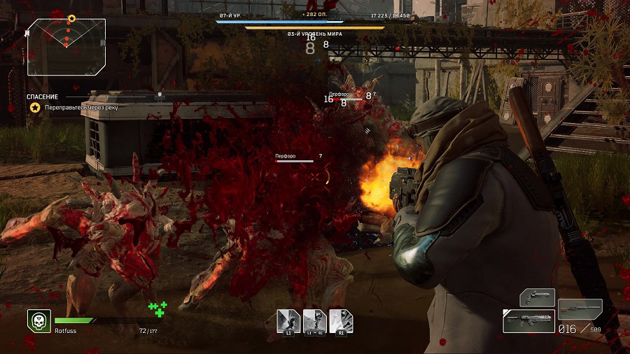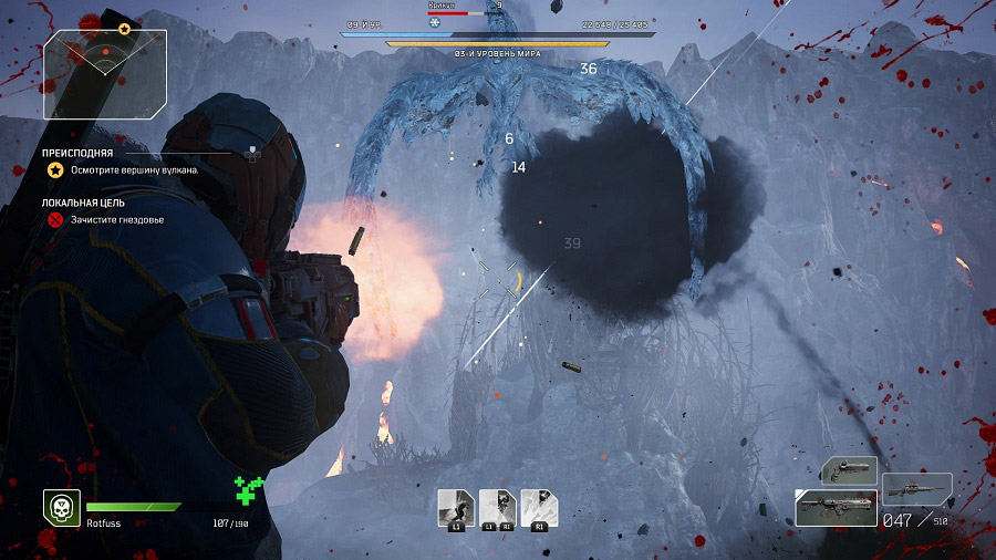 Стрельба в Outriders сочная и близка по ощущениям к все той же Gears of War. Управление четкое и плавное, но со снайперки на геймпаде все же целиться сложновато. Враги эффектно разбрызгиваются по стенам от взрывов, у них отлетают «запчасти» от попаданий в разные места, да и в целом они отлично «ловят» пули телом.