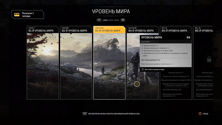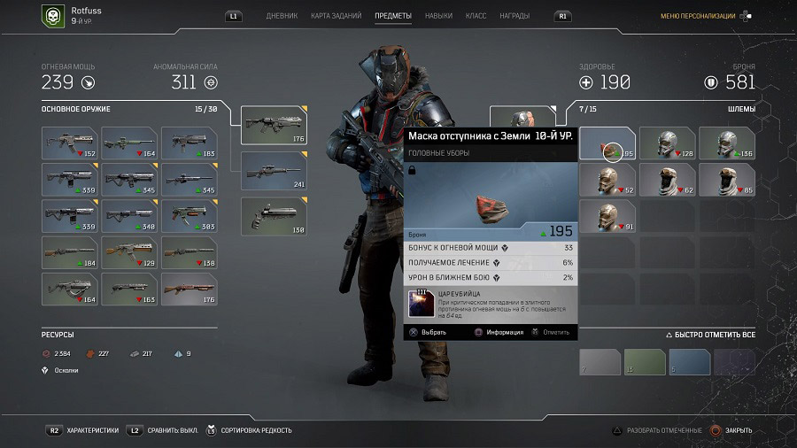 Оружие и одежда имеют своих характеристики и дополнительные бонусы. Экипировка делится по редкости и улучшается. Чтобы добыть лучшие вещи, нужно проходить миссии на максимальном уровне мира. Это местный вариант привычного уровня сложности.