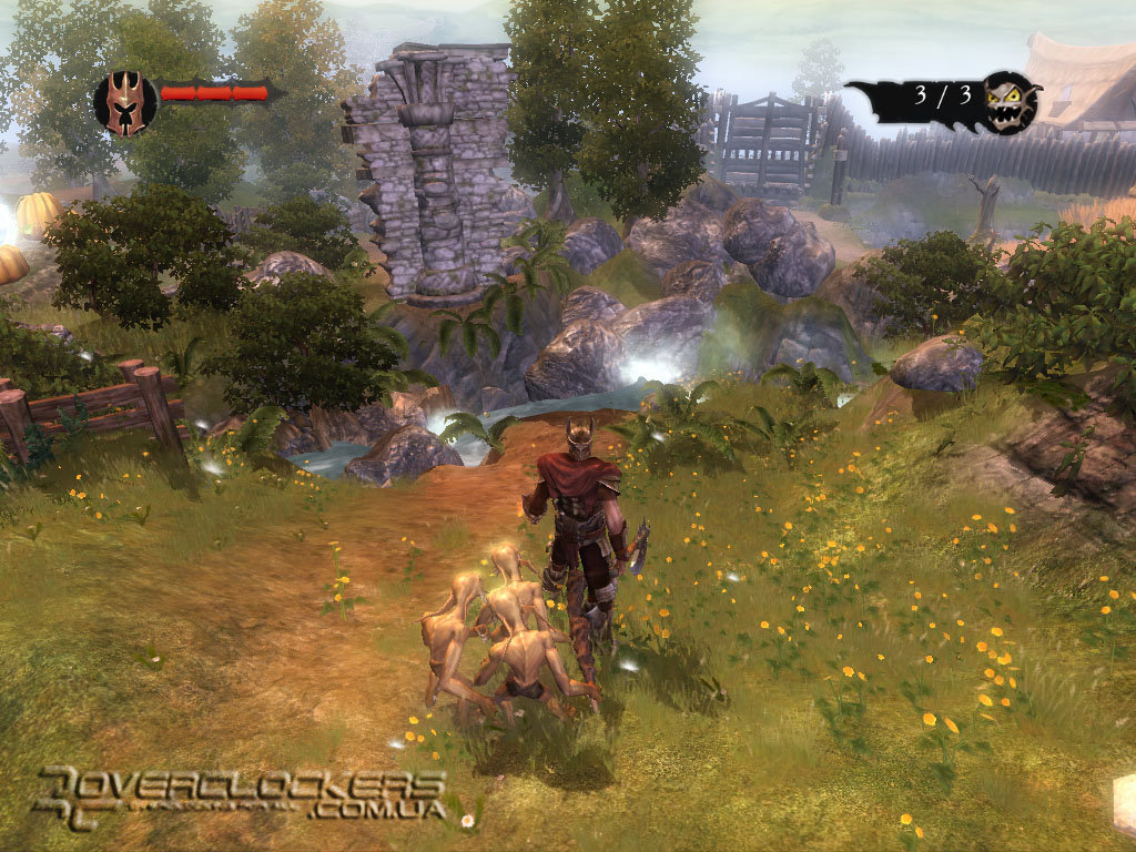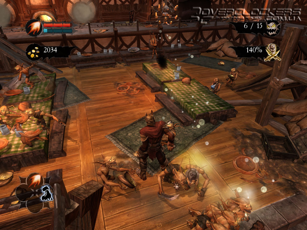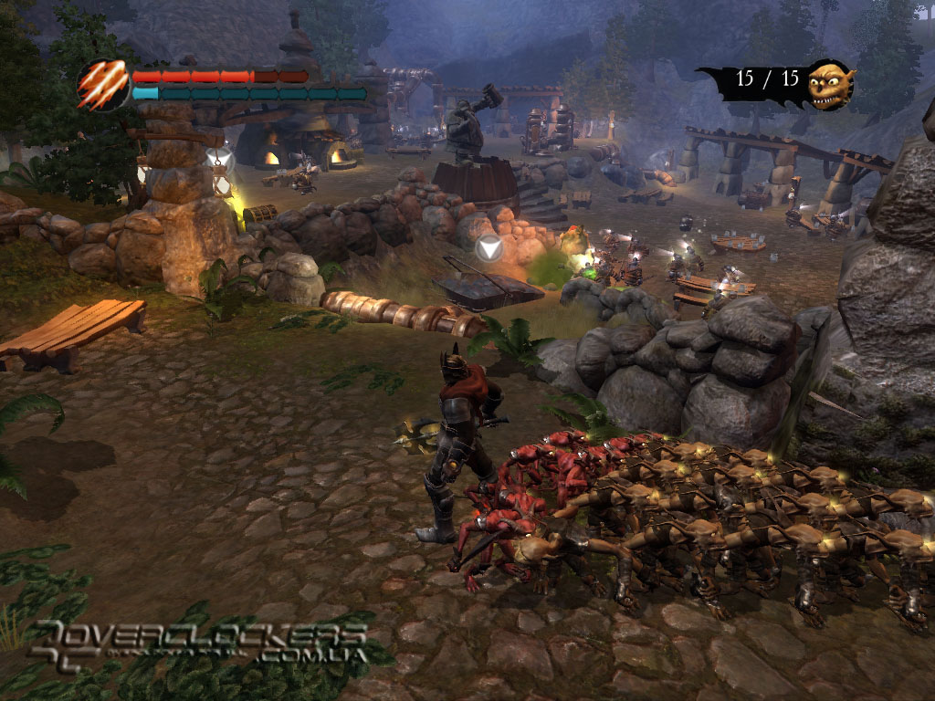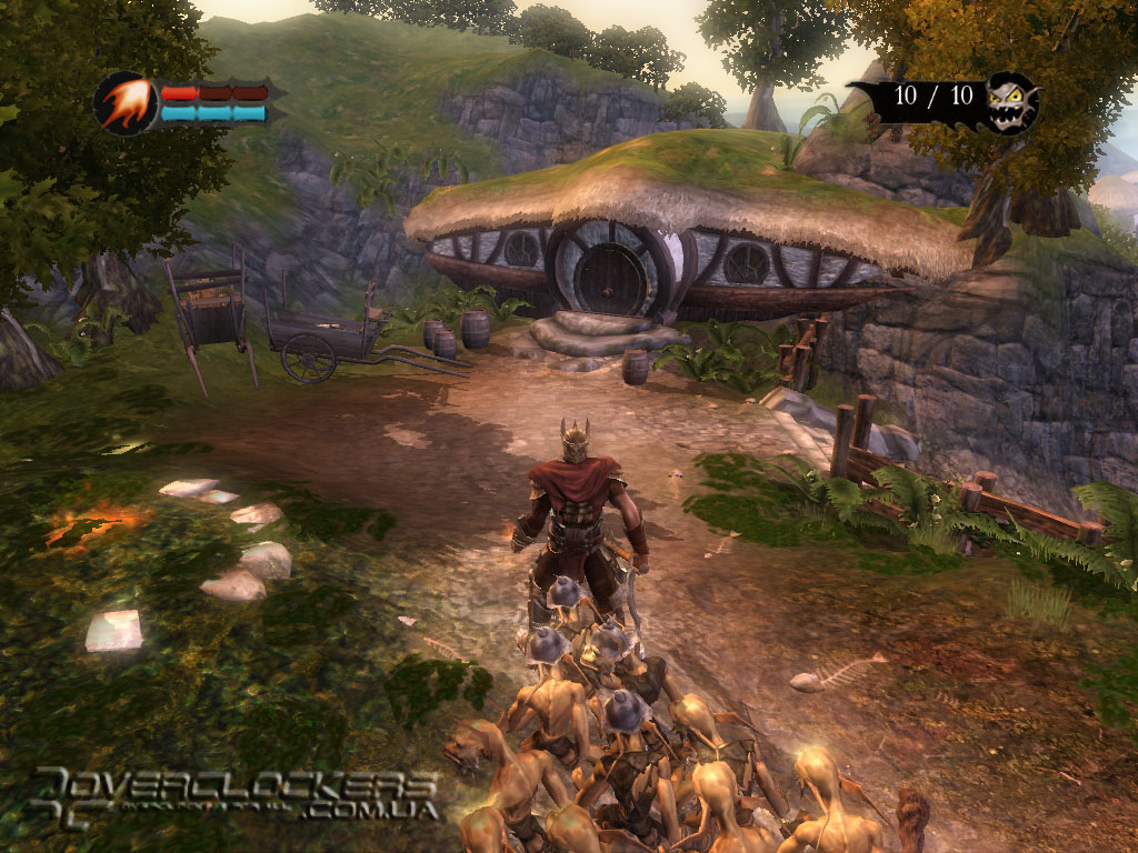 Управление своей армией довольно просто – посмотрели на цель и направили бойцов туда лишь одним кликом мыши. Они с удовольствием бросаются на врага, заодно круша и ломая все по пути под веселое улюлюканье. Весь этот беспредел смотрится весьма забавно. Наши маленькие разбойники не наделены особым интеллектом и могут нацепить на голову разбитую тыкву вместо шлема, прыгают по столам, с удовольствием осушают бокалы с пивом, гоняют бедных овец, не забывая при этом повторять свою коронную фразу со словами «for you, Master».