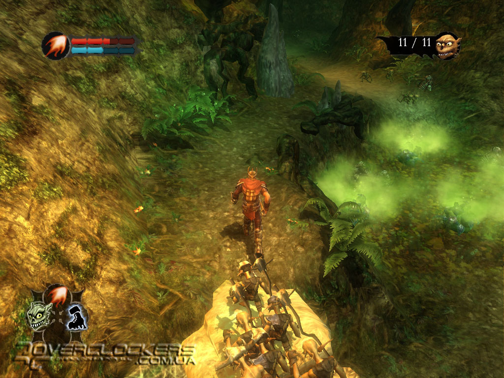 Но группами миньонов можно управлять и по отдельности, а также вручную указать цель для нападения. Иногда такие более тонкие стратегические возможности придется использовать в тяжелых ситуациях. Ведь больших противников не победить, атакуя «лоб в лоб», а необходимо использовать окружающую обстановку, предметы и комбинировать своих подопечных для атак разного типа. Некоторых монстров можно одолеть совместными усилиями миньонов разных стихий.