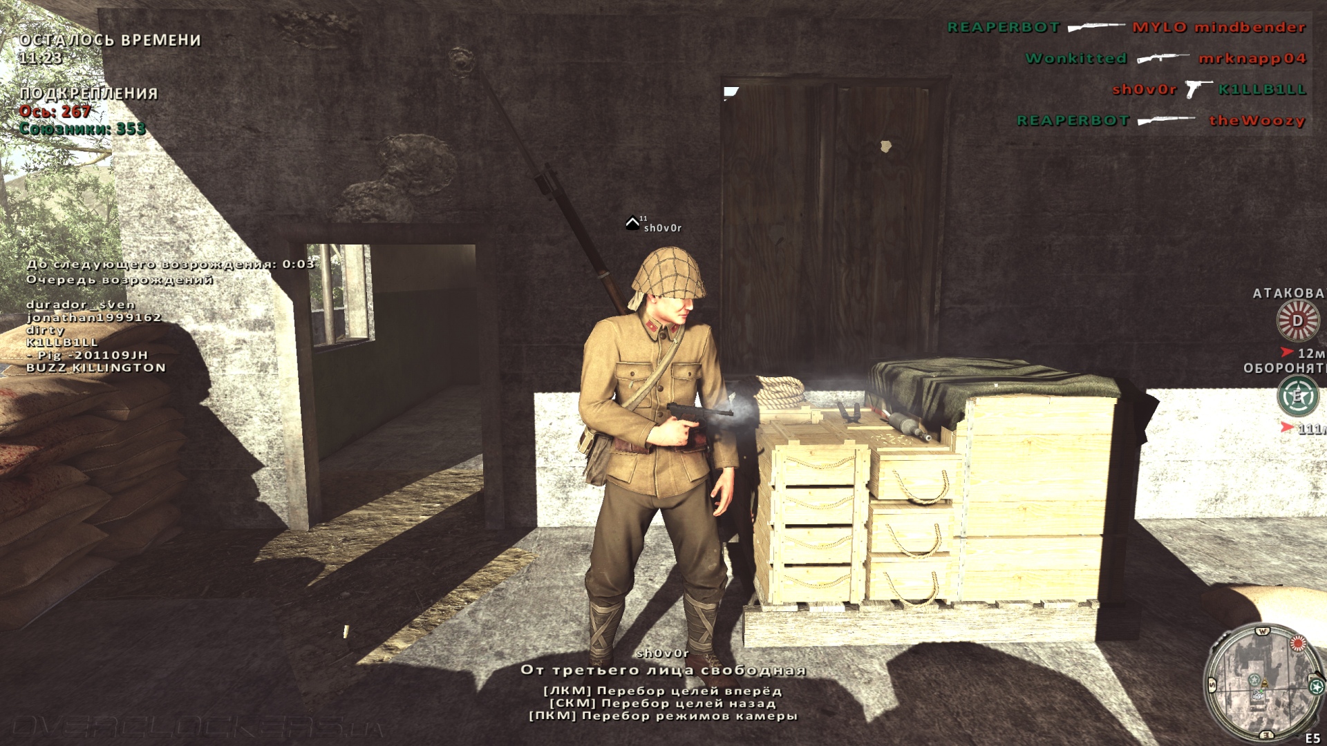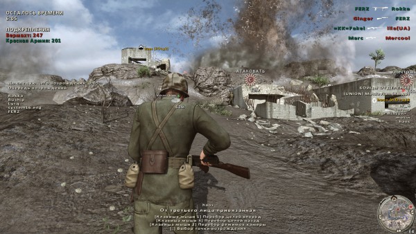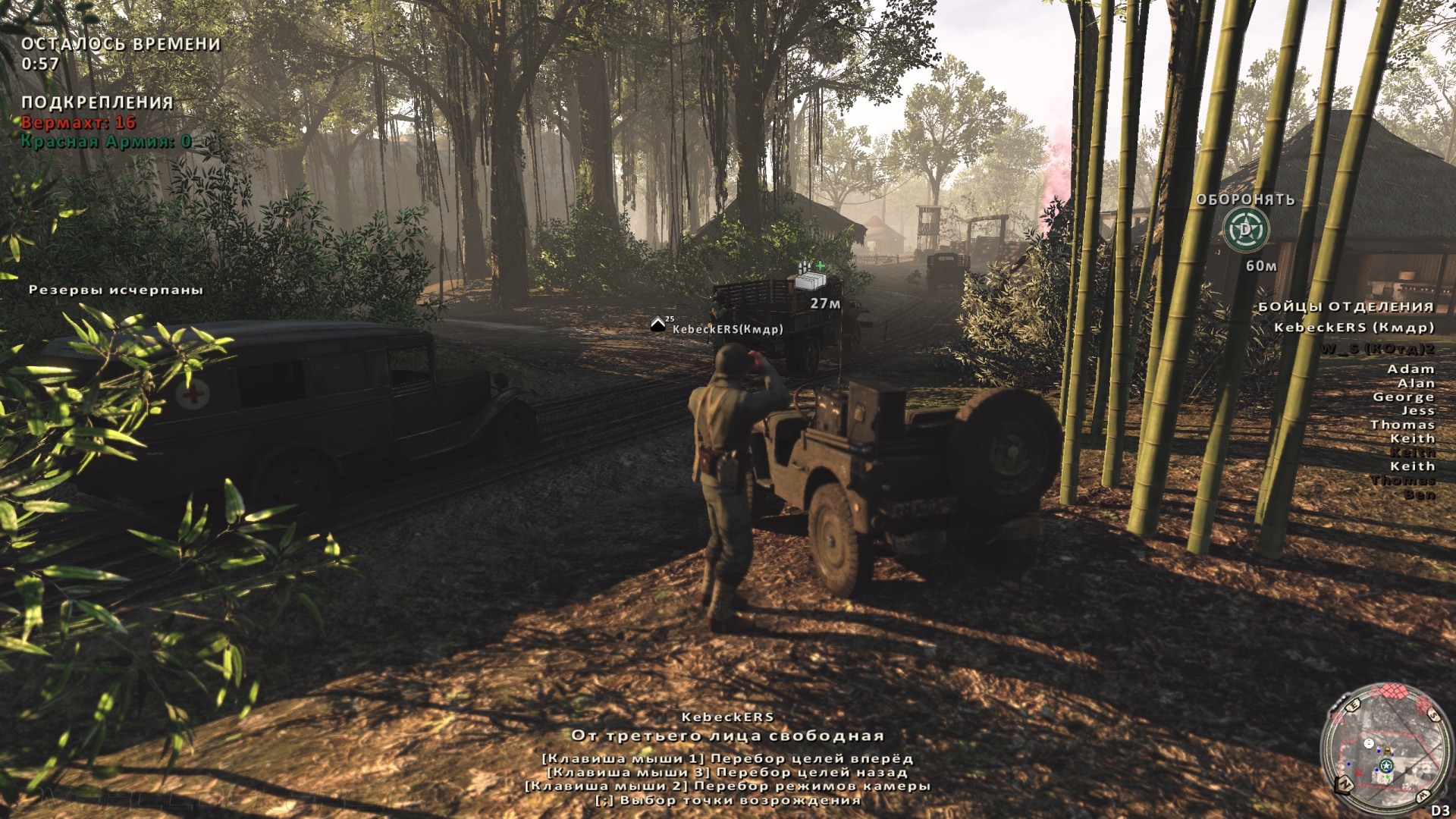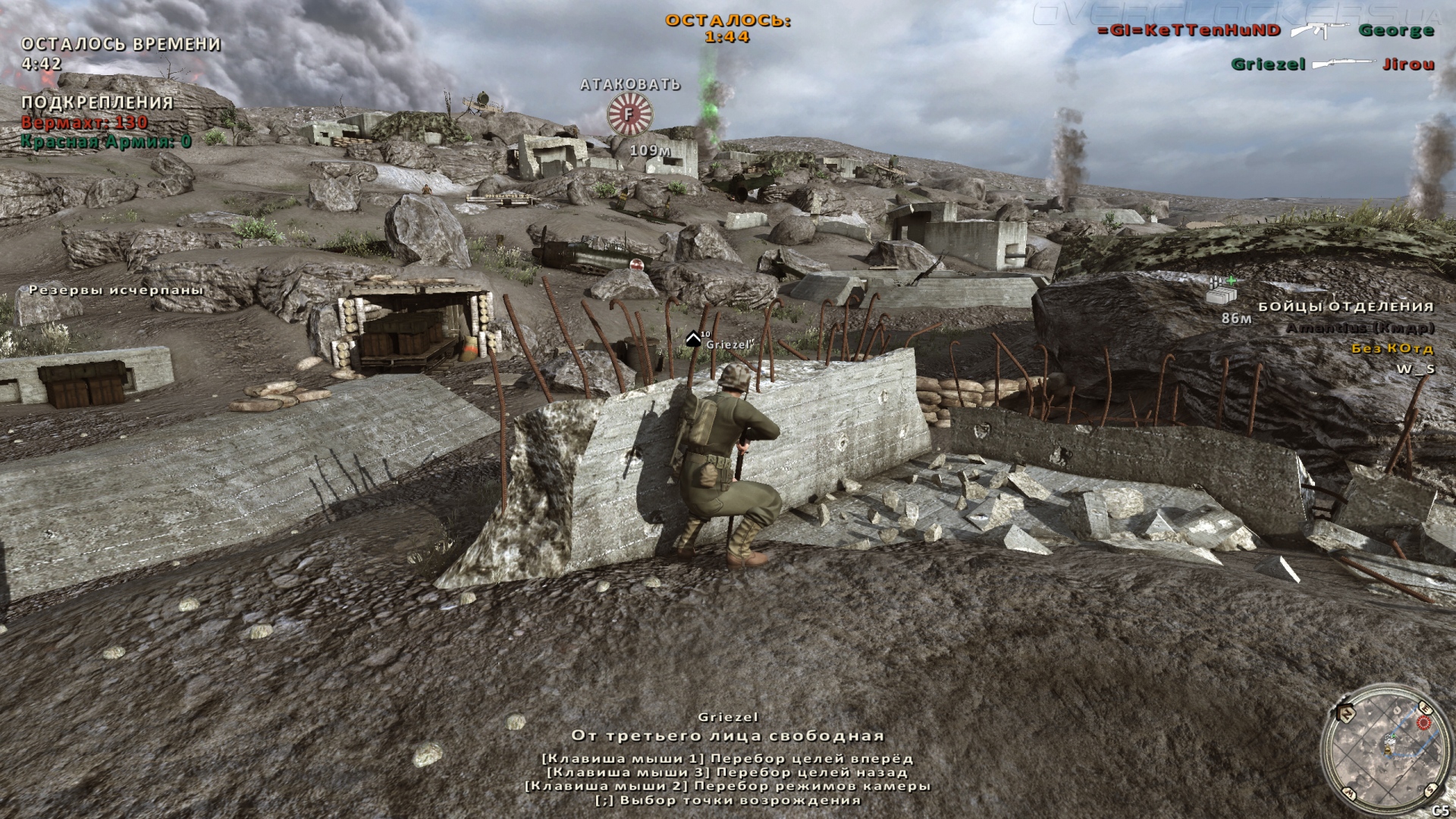 Главный командир несет на себе функции вызова огня артиллерии и авиаразведки. Выполнить соответствующие действия можно у специальных раций, разбросанных по карте. Предварительные точки для обстрела могут ставить любые командующие рангом ниже. Правильно выбранный момент и точный удар всегда помогут своей армии — расчистят зону для наступления или остановят натиск атакующих. Задача, кстати, непростая. Сложная архитектура и ландшафт часто заставляют передвигаться по карте, выбирая позицию, с которой можно поставить наиболее удачную точку для обстрела. Еще командующий имеет в арсенале две дымовые гранаты, что делает его весьма полезным и в прямой атаке.