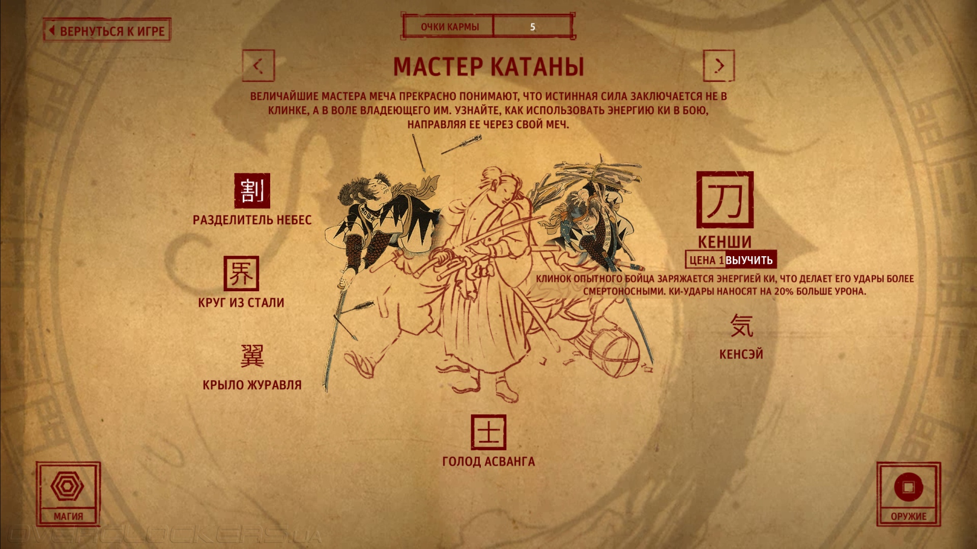 На уровнях щедро раскиданы деньги и различные магические предметы, которые тратятся на улучшения наших навыков и вооружения. Каждая единица оружия имеет четыре улучшения, которые позволяют открыть альтернативный режим стрельбы, увеличить скорострельность, мощность и т.п. При помощи особых магических кристаллов можно открыть некоторые уникальные способности, позволяющие вызывать отталкивающую ударную волну, восстанавливать здоровье или призывать магический щит. Специальные очки кармы дают возможность увеличить запас здоровья и выносливости, повысить мощность атак против определенного типа врагов, открыть новые удары катаны и многое другое.