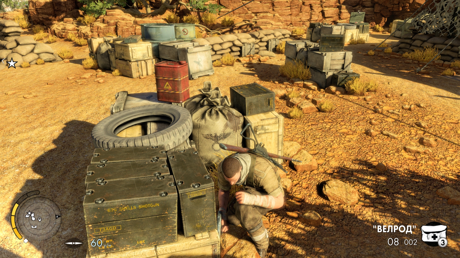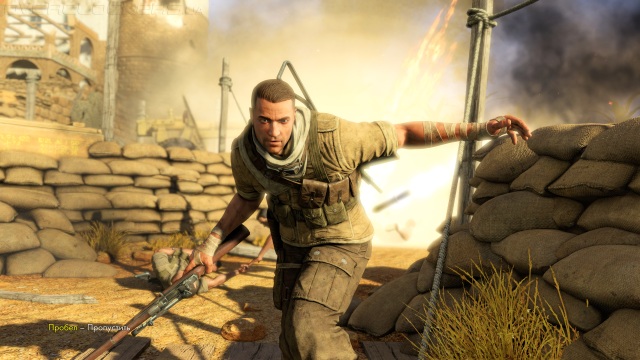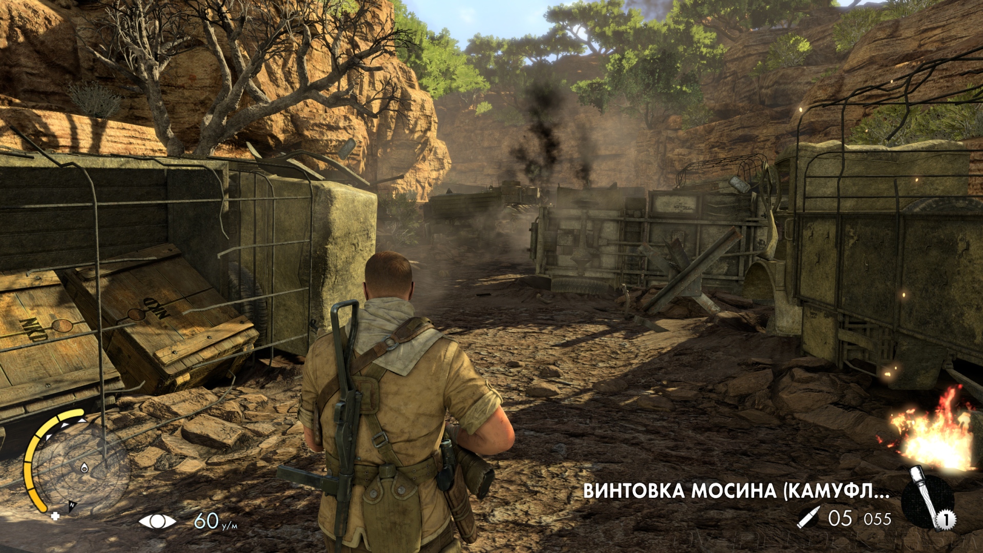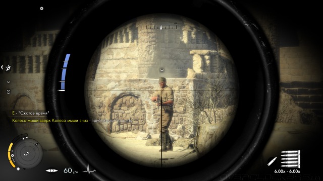 Сама стрельба из винтовки работает по знакомым принципам реалистичной баллистики с поправкой на расстояние и скорость полета пули, если стреляете по движущейся цели. На всех уровнях сложности от среднего и ниже есть маркер реального попадания пули в прицеле. Это заметно упрощает жизнь и позволяет реально воевать с бронетехникой, стреляя в крошечные уязвимые места с дальнего расстояния. Есть задержка дыхания, которая заодно немного замедляет время. Это второй важный помощник меткого снайпера. Вверх мастерства — словить нужный момент и поразить сразу парочку целей одной пулей. Есть и взрывающемся элементы окружения, которые позволят веселее и с огоньком отправлять на тот свет жертвы, взрывая цистерны или баки с топливом.