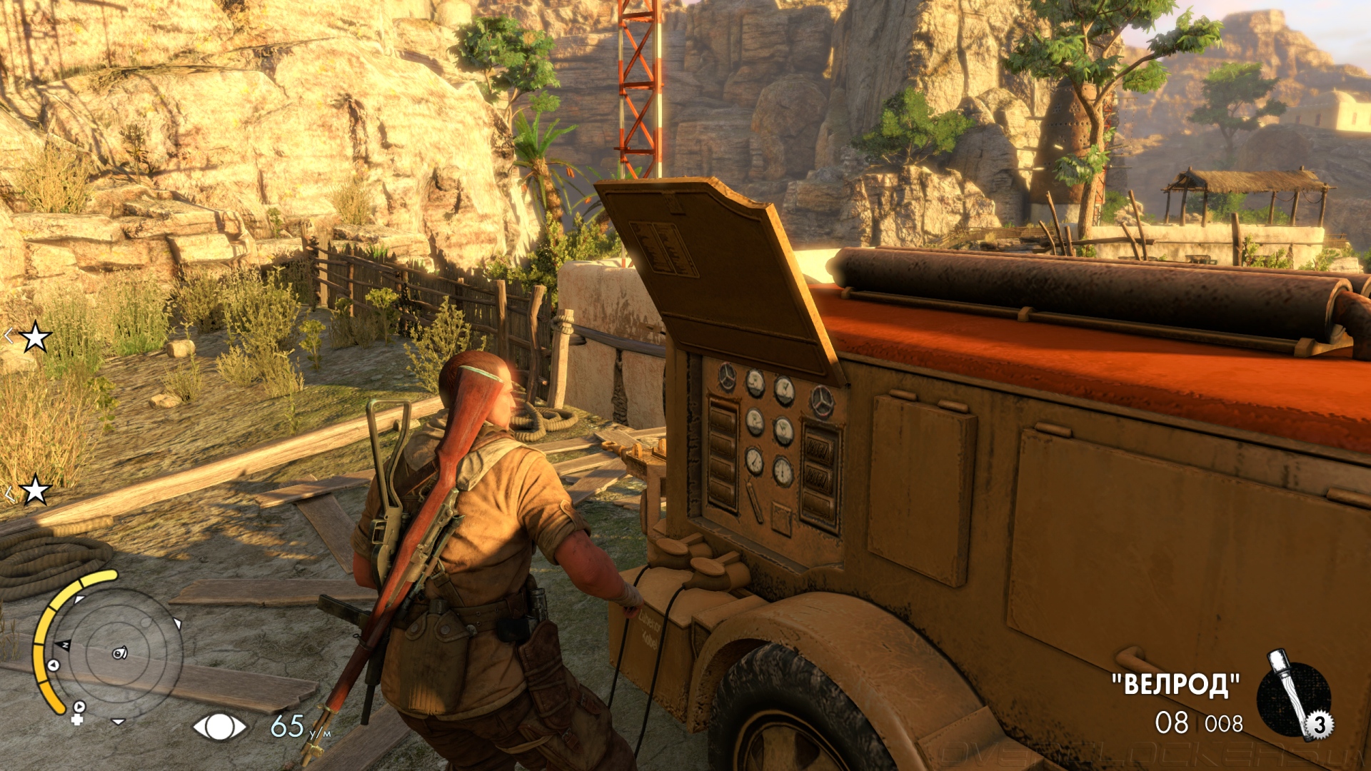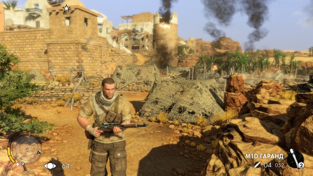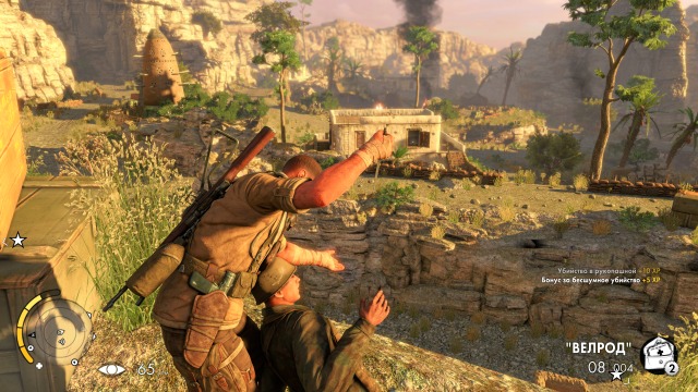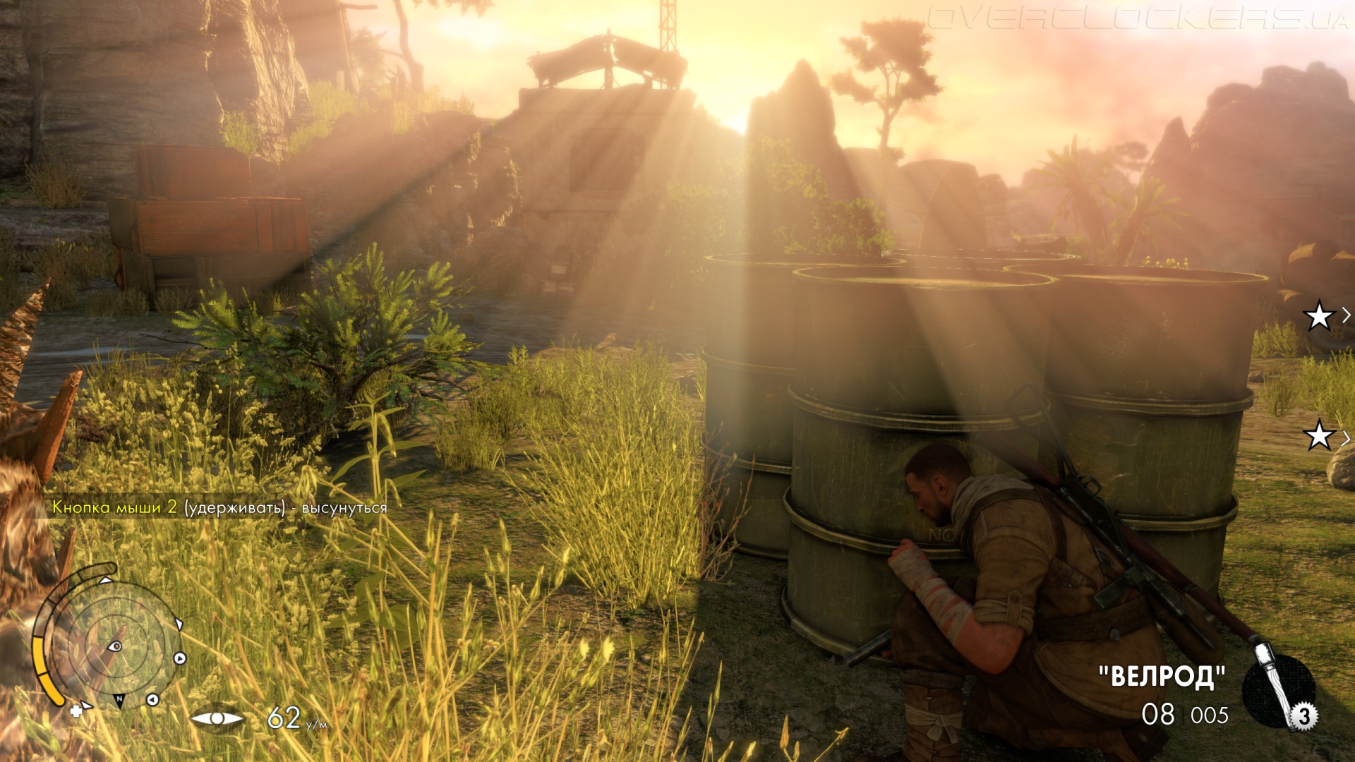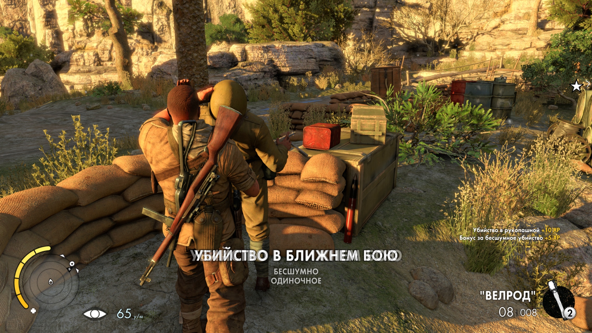 Сама стрельба из винтовки работает по знакомым принципам реалистичной баллистики с поправкой на расстояние и скорость полета пули, если стреляете по движущейся цели. На всех уровнях сложности от среднего и ниже есть маркер реального попадания пули в прицеле. Это заметно упрощает жизнь и позволяет реально воевать с бронетехникой, стреляя в крошечные уязвимые места с дальнего расстояния. Есть задержка дыхания, которая заодно немного замедляет время. Это второй важный помощник меткого снайпера. Вверх мастерства — словить нужный момент и поразить сразу парочку целей одной пулей. Есть и взрывающемся элементы окружения, которые позволят веселее и с огоньком отправлять на тот свет жертвы, взрывая цистерны или баки с топливом.