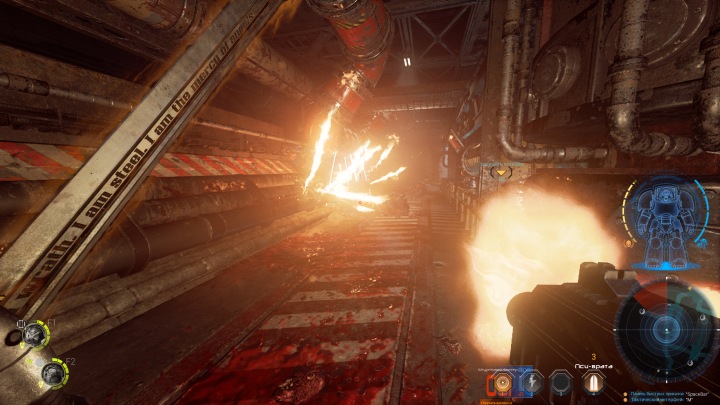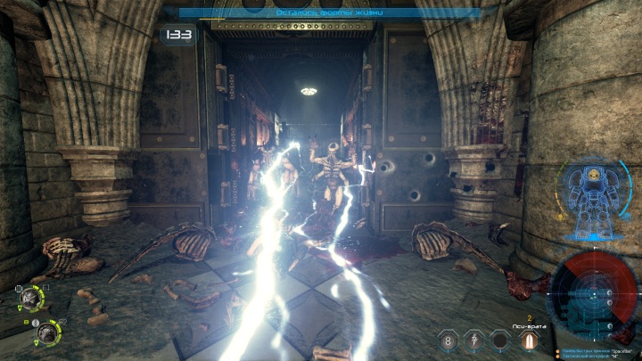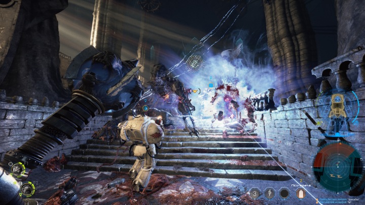 Все боевые умения активно используются в схватке. Монстров-стрелков отсекаете из огнестрельного или плазменного оружия, атакующих вблизи рубите мечом или дубиной, не забывая о молниях и других пси-умениях. Массовые стычки быстро превращаются в цветастое шоу с обилием вспышек, отлетающими тушками и яркими взрывами на заднем плане. В некоторых местах заботливо расставлены взрывающиеся емкости, отдельные трубы выпускают светящие потоки жидкости. Так что есть даже некоторый уровень интерактивности, хотя общее взаимодействие с миром весьма ограниченно. Оружие воспринималось бы еще убедительнее, будь намеки на разрушаемость отдельных элементов интерьера или осколки при попадании по ним.