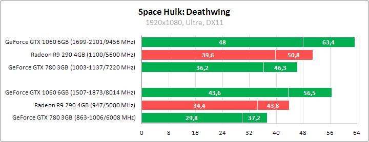 Space Hulk: Deathwing выдвигает высокие требования к производительности графических ускорителей. И мы решили дополнить обзор небольшим сравнительным тестированием трех видеокарт, что даст общее представление о том, какого уровня решения вытянут максимальное качество графики. Тестирование проводилось на нашей стандартной тестовой конфигурации для видеокарт с использованием драйверов NVIDIA GeForce 376.19 и Radeon: AMD Crimson 16.12.1. Было разблокировано ограничение fps путем редактирования файла конфигурации GameUserSettings.ini. Достаточно прописать там две строки в первом разделе настроек: