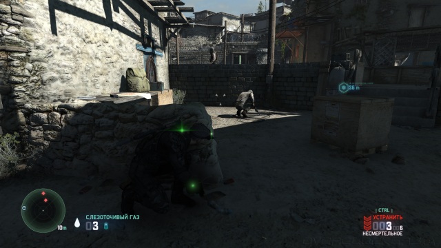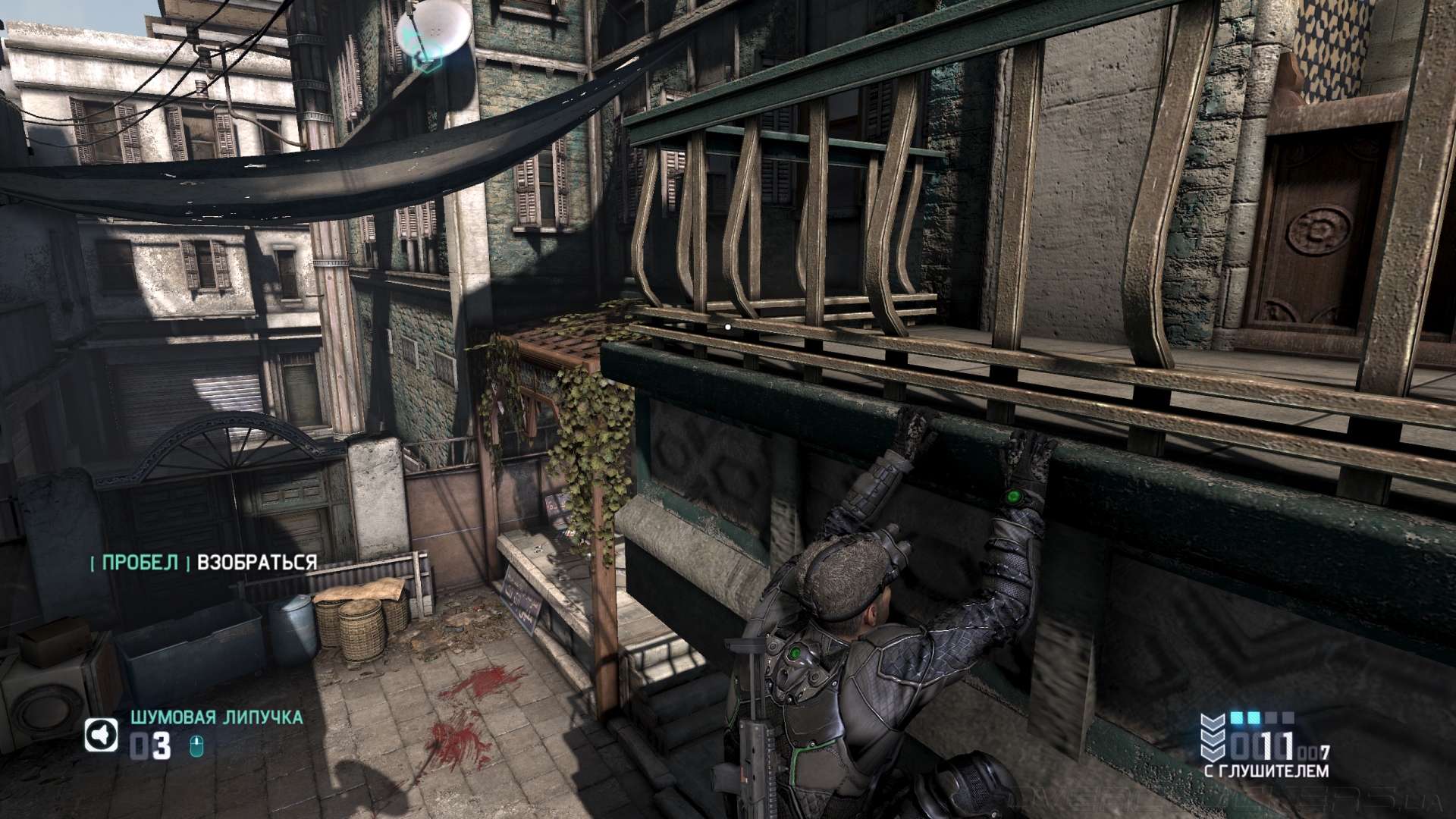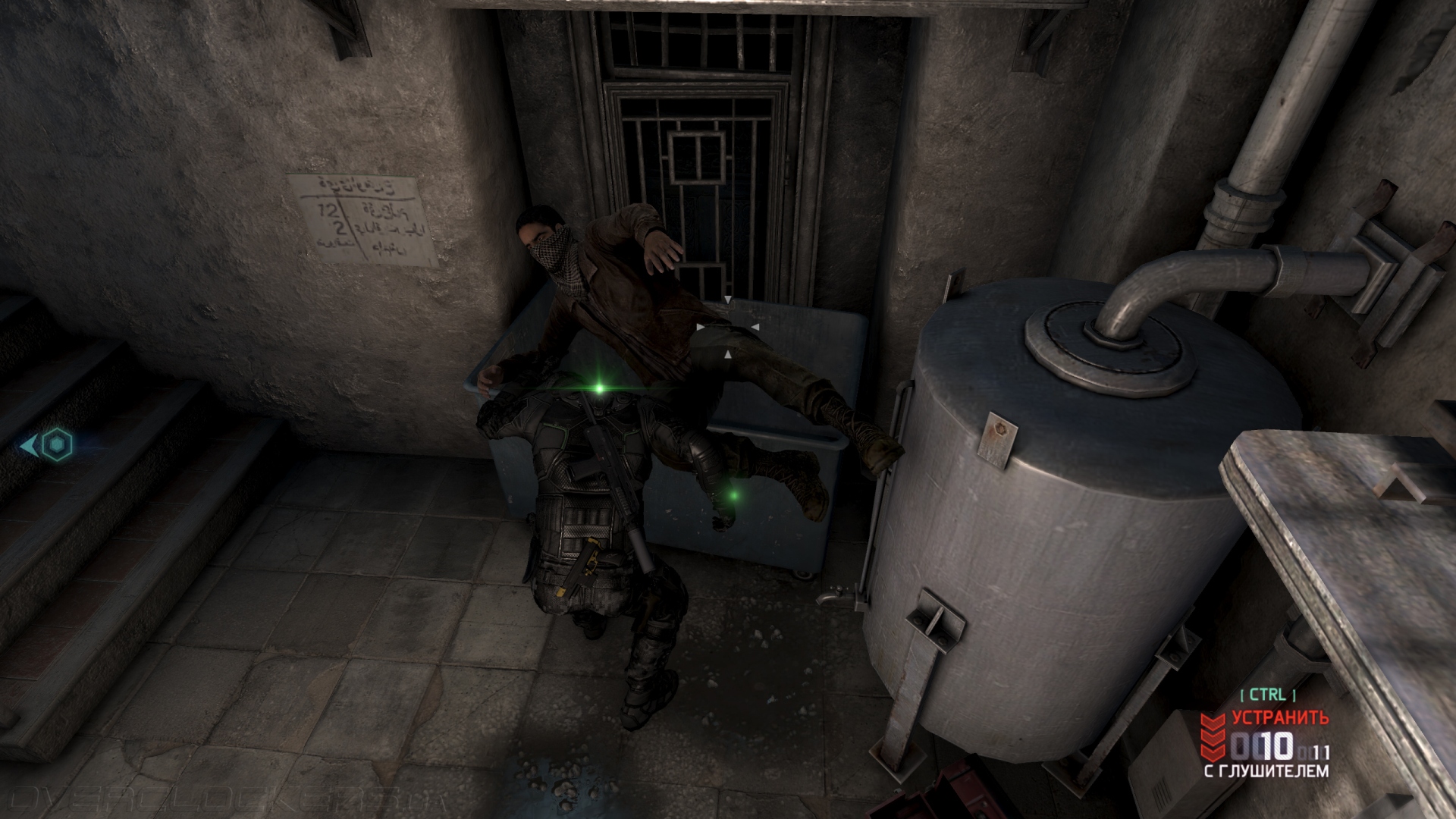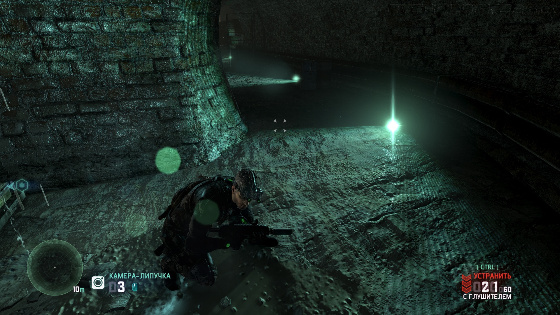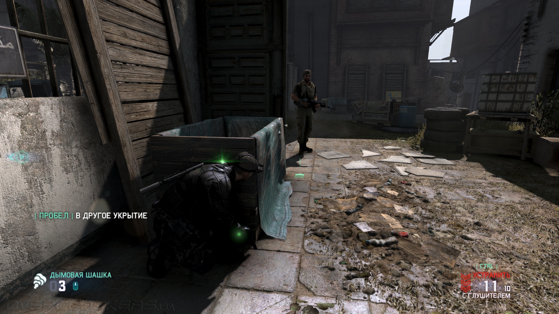 Дизайн уровень изначально рассчитан на такую вариативность. Кроме основного маршрута всегда есть небольшие ответвления: можно нырнуть в вентиляционную шахту или обойти врагов по карнизу дома, проникнув в помещение через окно. Уйти из зоны видимости помогут трубы у потолка. Система укрытий уже прочно увязана на прилипания к стенам, шкафам и разным ящикам. Порою это выглядит глуповато, особенно если часовой подсвечивает фонариком зону прямо за вжавшимся в укрытие Фишером, или выглядывает в окно, за которым висит герой. С другой стороны, такая система уже не дает полноценной гарантии скрытности даже в полной темноте. Стоит пошевелиться — и вас моментально заметят.