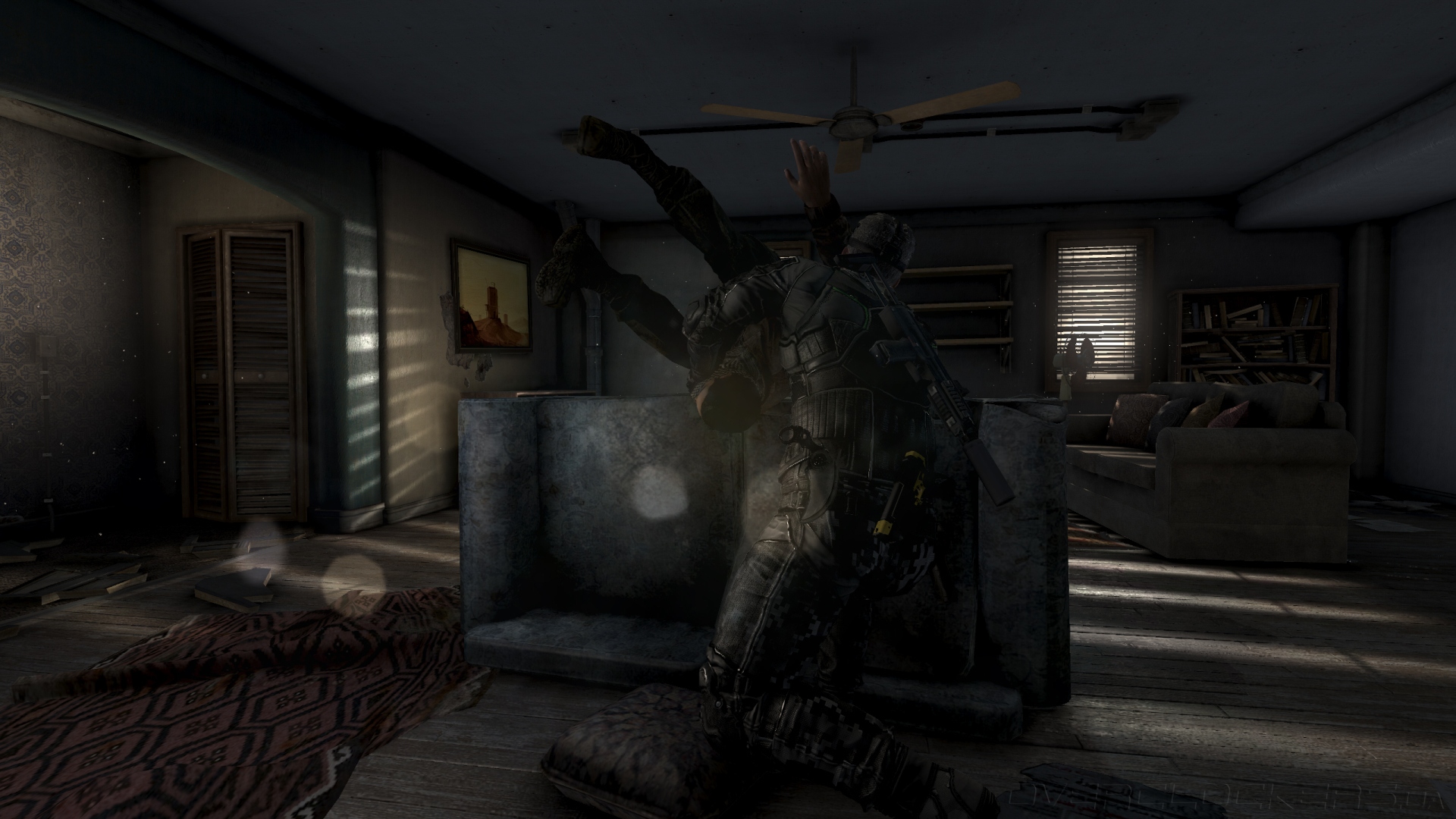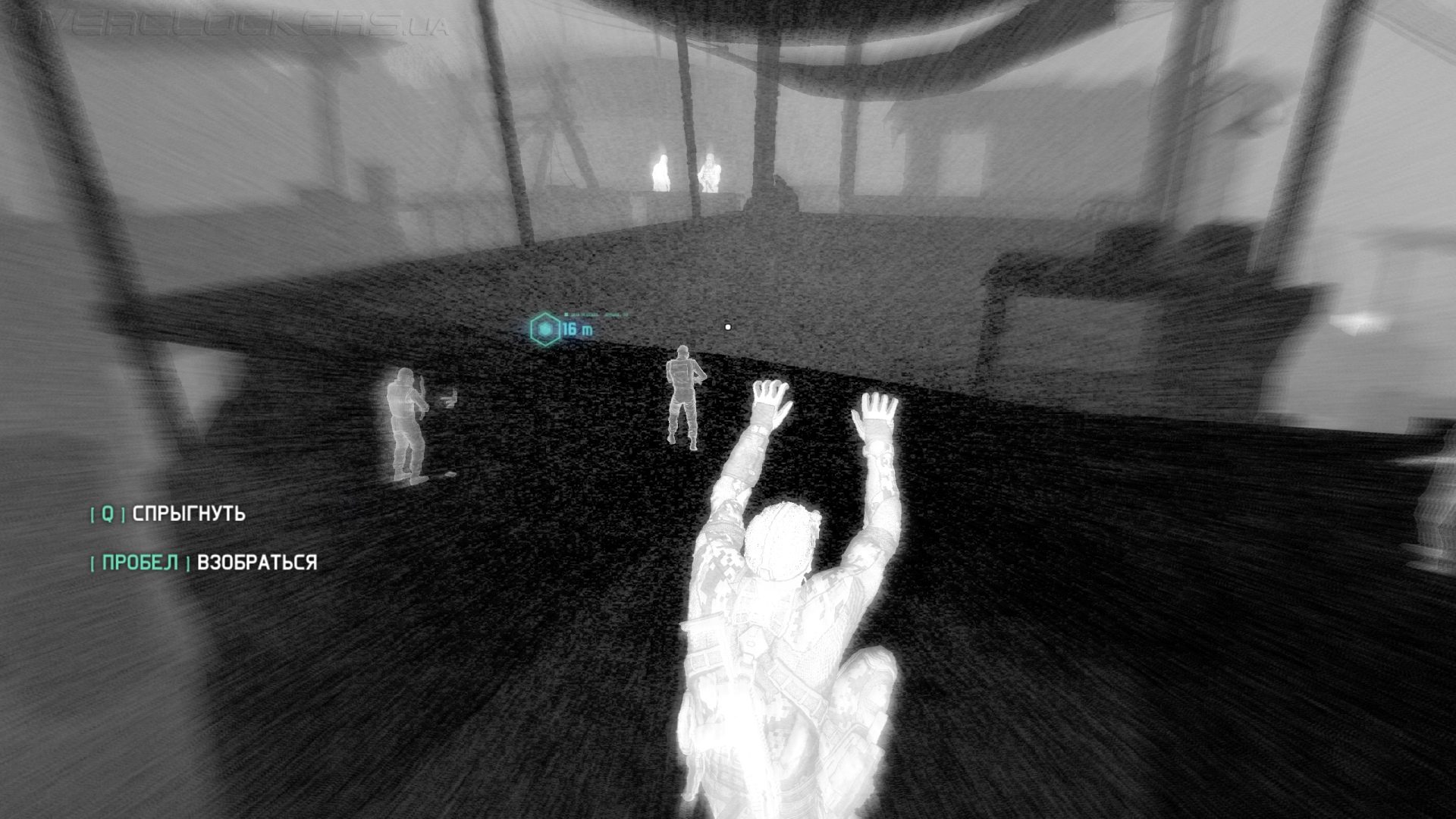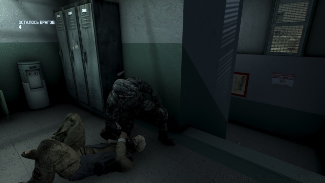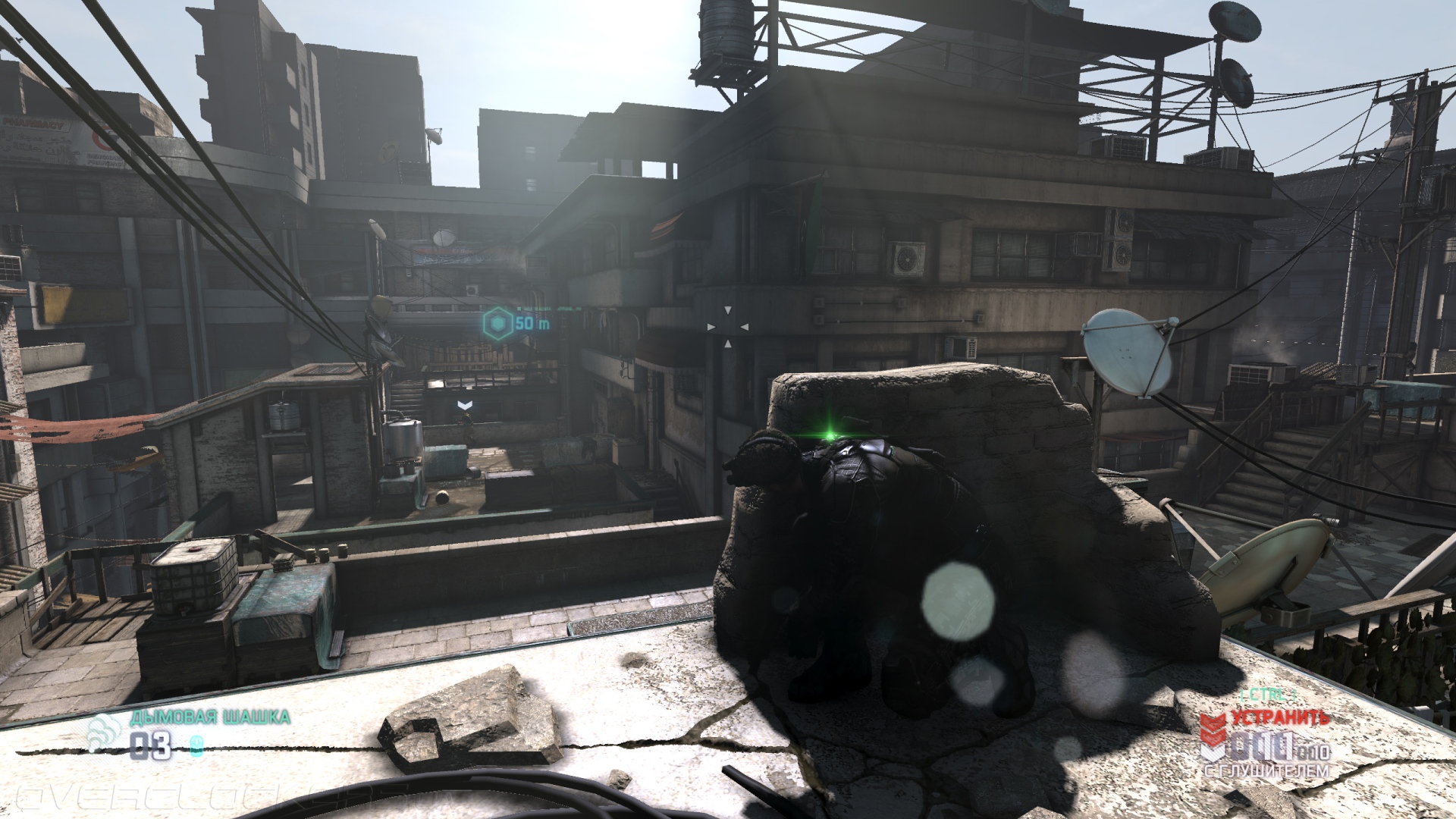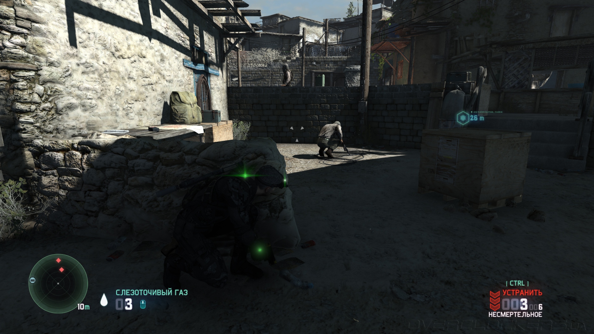Дизайн уровень изначально рассчитан на такую вариативность. Кроме основного маршрута всегда есть небольшие ответвления: можно нырнуть в вентиляционную шахту или обойти врагов по карнизу дома, проникнув в помещение через окно. Уйти из зоны видимости помогут трубы у потолка. Система укрытий уже прочно увязана на прилипания к стенам, шкафам и разным ящикам. Порою это выглядит глуповато, особенно если часовой подсвечивает фонариком зону прямо за вжавшимся в укрытие Фишером, или выглядывает в окно, за которым висит герой. С другой стороны, такая система уже не дает полноценной гарантии скрытности даже в полной темноте. Стоит пошевелиться — и вас моментально заметят.