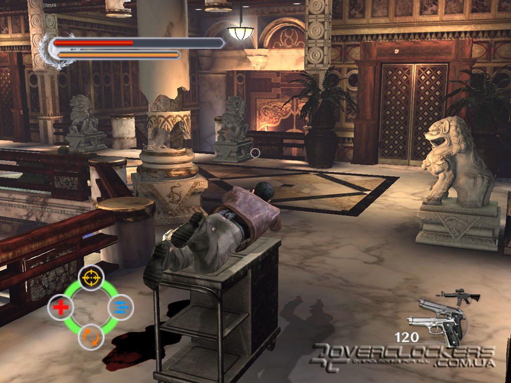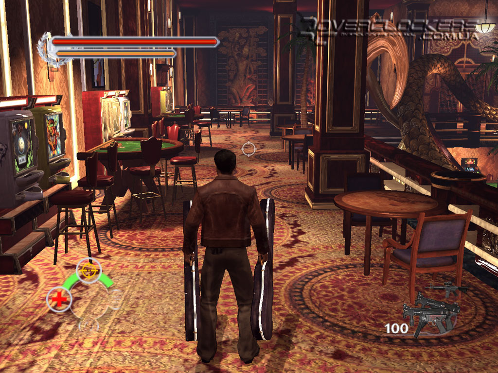 В игре есть объекты, использование которых дает нам доминирование над врагами. Можно бегать по перилам, съезжать по канатам или запрыгнув на люстру болтаться под потолком, периодически поливая врагов свинцом.