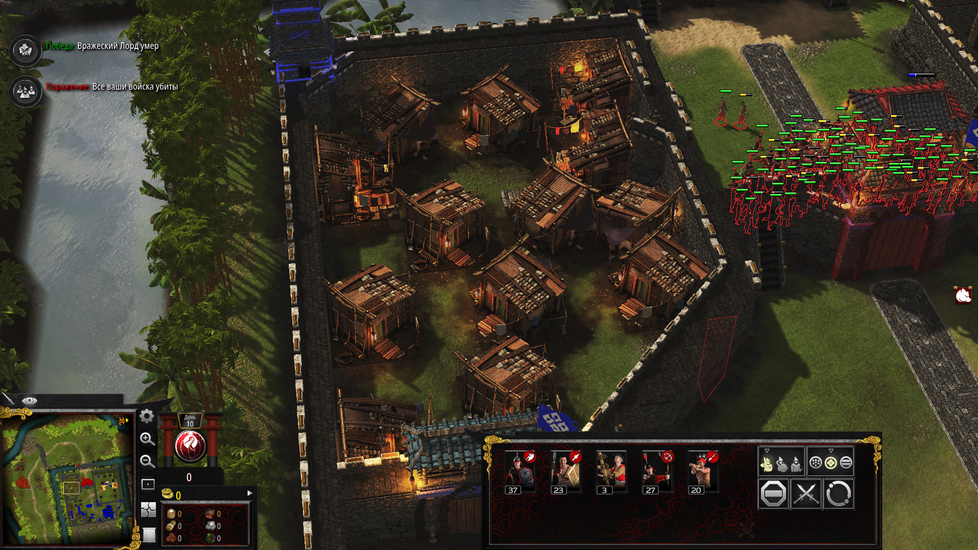 ИИ часто настолько туп, что солдаты защиты не реагируют вовсе, если их не трогать. Но иногда агрятся. Для этого мы и взяли пехоту с щитами. Она защищает лучников, пока те разделывают военачальника. Когда здоровье того на ноле, он сдается. Дальше просто подводим к нему отряды и военачальник наш.