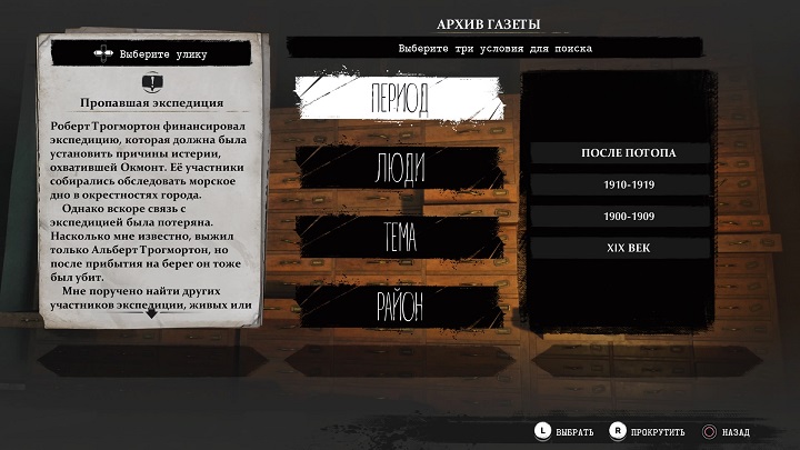 Как нуарный-детектив The Sinking City выглядит лучше всего. Местная система расследования приближена к реальности, поэтому герою приходится изучать места преступления, собирать улики, восстанавливать ход событий и буквально двигать дела вперед своими умозаключениями, сопоставляя факты и делая выводы. Здесь никто не подскажет куда идти и где искать зацепки — все предстоит исследовать самому, копаясь в архивах и выуживая информацию из свидетелей.