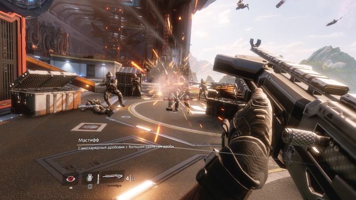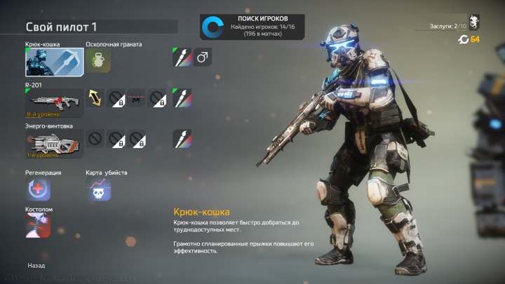 Большой выбор оружия и у бойцов-пилотов. Это различные разновидности автоматов, дробовики, мощные энергетические винтовки. Есть гранаты разного типа действия и с разной поражающей способностью. Многое доступно изначально. По мере повышения уровня владения каждый оружием открываются разные апгрейды для него — новые прицелы, емкая обойма и т.п. Также пилот обладает особыми способностями. Он может использовать крюк или повисать на стене. Можно задействовать усилительный бонус, вызывать роботов-помощников или ставить турель. С ростом уровня набор умений расширяется, но ограничения по активным навыкам заставляют выбирать какую-то определенную специализацию. В игре есть система испытаний. Выполнив какое-то количество убийств из определенного оружия или какие-то трюки, вы получите специальные бонусы.