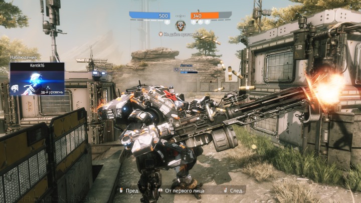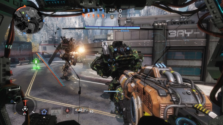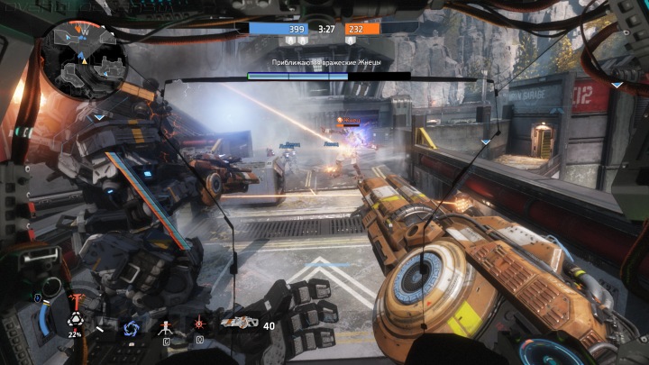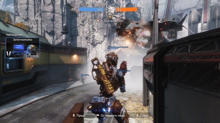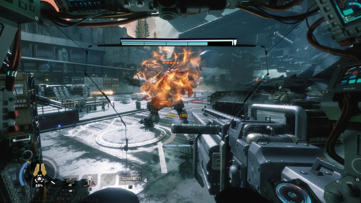 По мере набора очков появляется возможность вызова титанов, и сражение переходит в новую фазу. Теперь уже стальные махины поливают все вокруг огнем, используют ракеты и мины, давят разную мелочь под ногами. Но общий баланс позволяет противостоять им и средствами обычного бойца. Используя пробежки по стенам, игроки становятся маневренными и менее уязвимыми. Запрыгнув на спину титана, можно его повредить — с первого раза откручиваете какую-то заглушку, а во втором прыжке кидаете внутрь гранату. Титаны могут действовать автономно, управляясь искусственным интеллектом. Это позволяет разделяться и охотится за юркими врагами, которые норовят запрыгнуть на спину вашего меха.