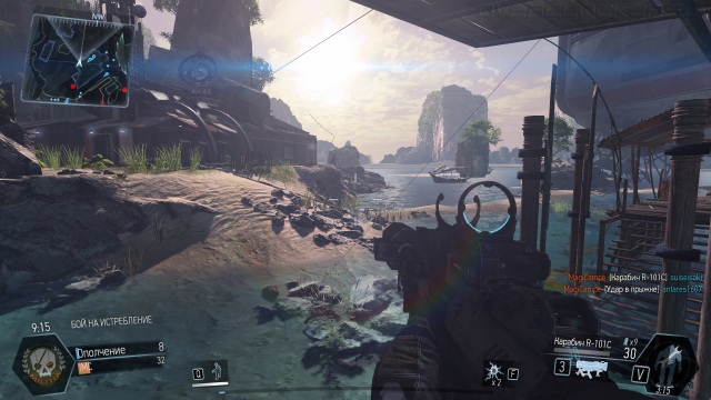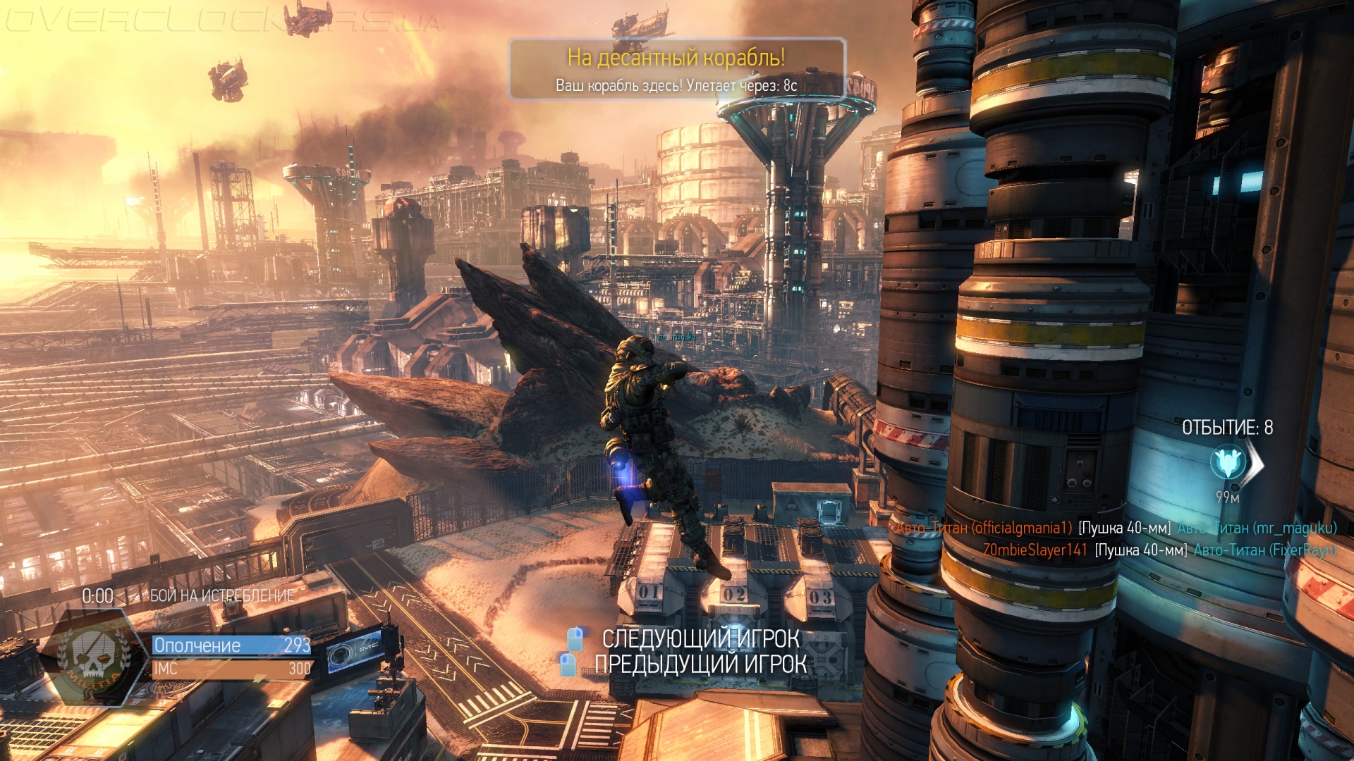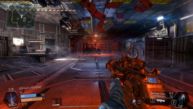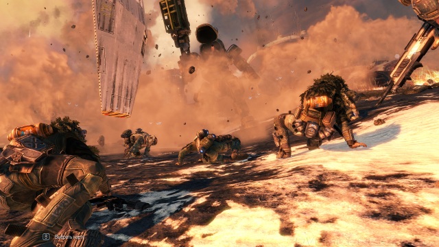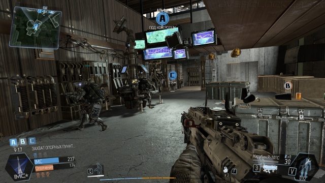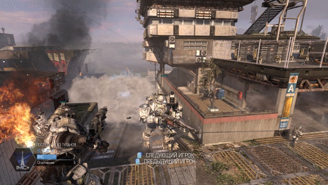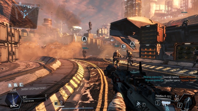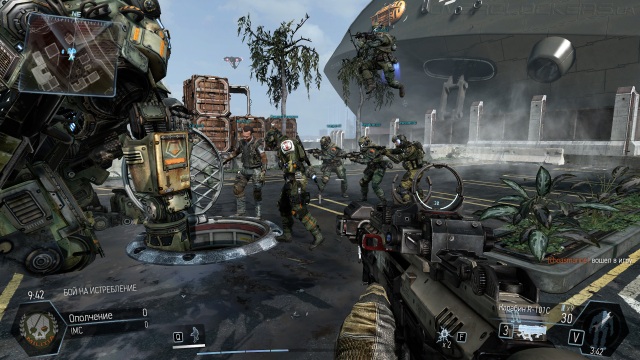 Первая уникальная особенность игры, о которой стоит упомянуть — это не мехи, а комбинированный бой с ботами. Нечто подобное имеется и в Call of Duty, но в Titanfall у компьютерных болванчиков более важная роль. Перед нами стараются разыгрывать настоящее зрелище, предлагая некую смесь обычного сетевого шутера и скриптового боевика. Наиболее эффектно это работает в местной сетевой кампании, у которой даже присутствует некий пафосный сюжет. Каждая миссия предваряется небольшой сценкой — брифинг у начальства, битва космических кораблей и т.п. Потом идет высадка десанта — рядом с нами выпадают капсулы, вздымая клубы дыма, из которого выбегают отряды солдат. Командир на роботе-титане может проломить стену, освобождая путь пехоте. Ну а потом весь смешанный отряд из компьютерных и реальных бойцов устремляется в бой и начинается обычная схватка между двумя противоборствующими сторонами. Боты сразу стремятся сойтись в лобовой атаке, формируя эффект массовки и давая нам возможность проредить их ряды своей меткой стрельбой. Естественно, что они же падают первыми жертвами в бою. Но для постоянного поддержания напряжения нам на карту периодически сбрасывают новые подкрепления для обеих команд.
