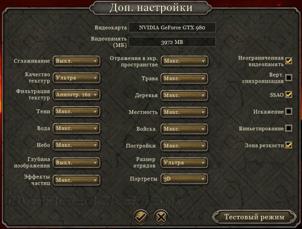 Установлено максимальное качество почти всех параметров. Отключено сглаживание, эффект глубины резкости и эффекты искажения. Конфигурация настроек отображена ниже. Тестирование проводилось при разрешениях 1920x1080 и 2560x1440.