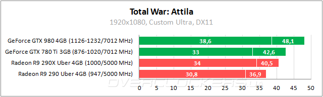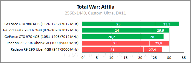 С Full HD все участники легко справились, продемонстрировав высокий fps. Старший представитель AMD, Radeon R9 290X, идет наравне с GeForce GTX 780 Ti. С уверенным отрывом лидирует GeForce GTX 980.